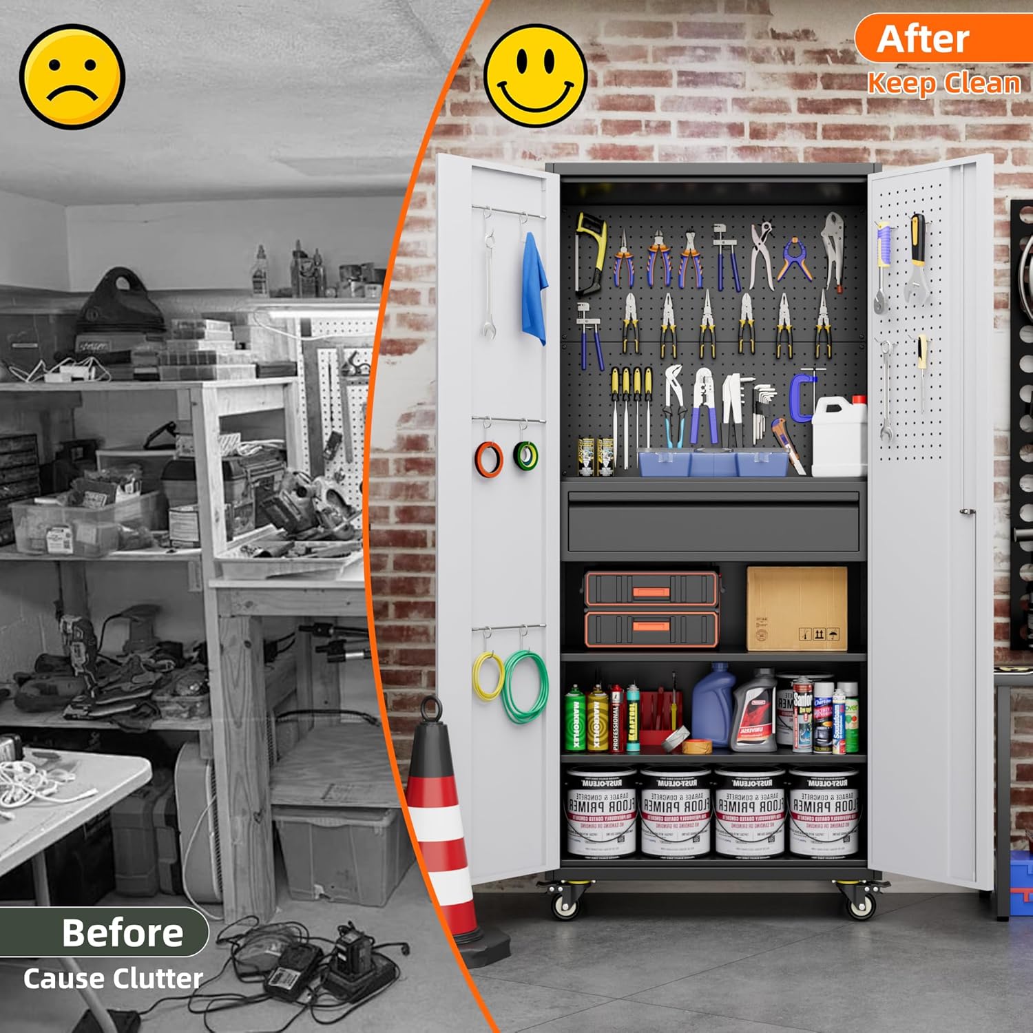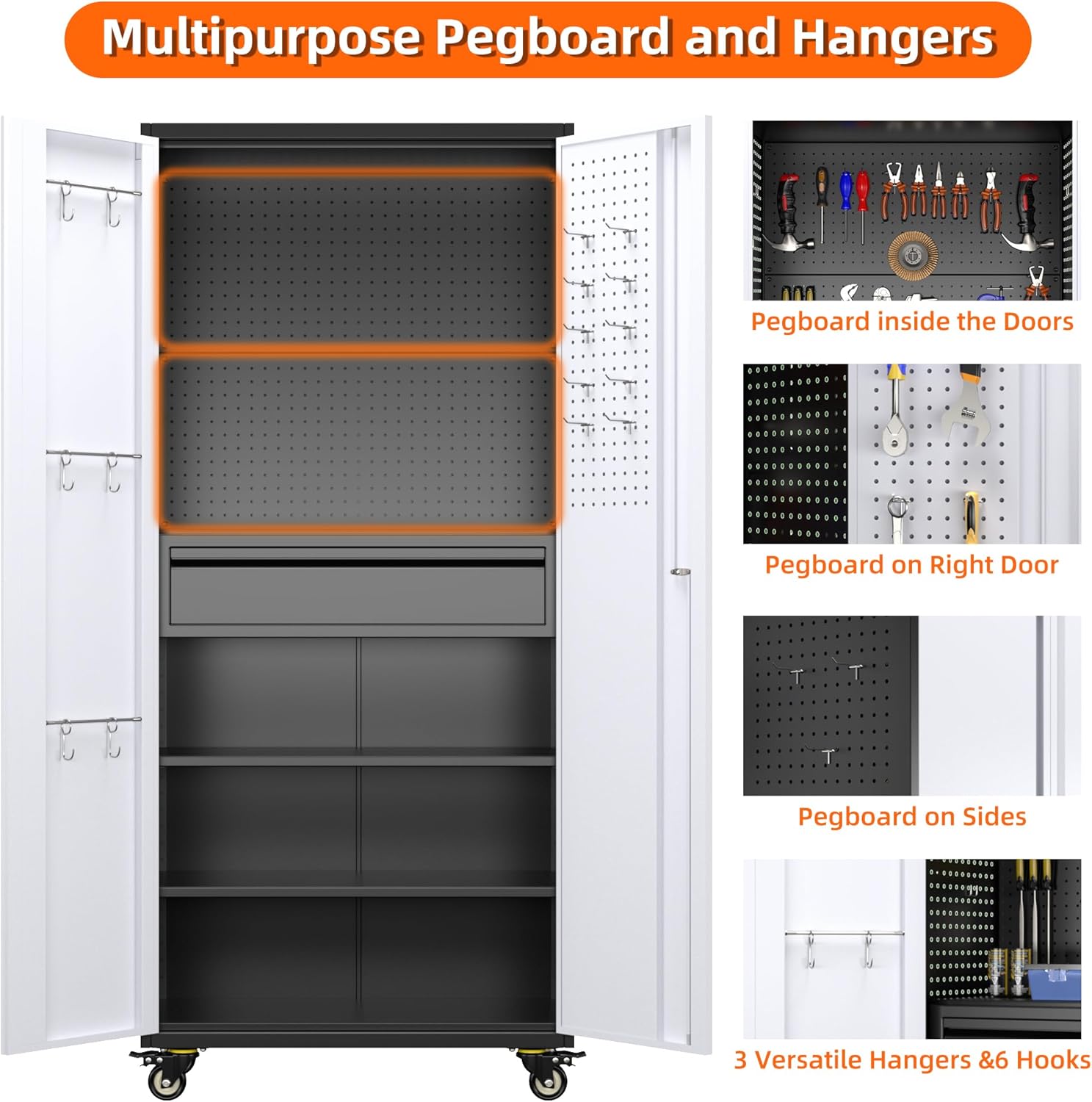 • 【Upgraded Design & More Space】 Storage cabinet offers plenty of space to meet your storage needs. There are pegboard on the cabinet right door and 2 Sides. The left door has a hanging rod and 6 small hooks. Open the door and inside there is a big drawer