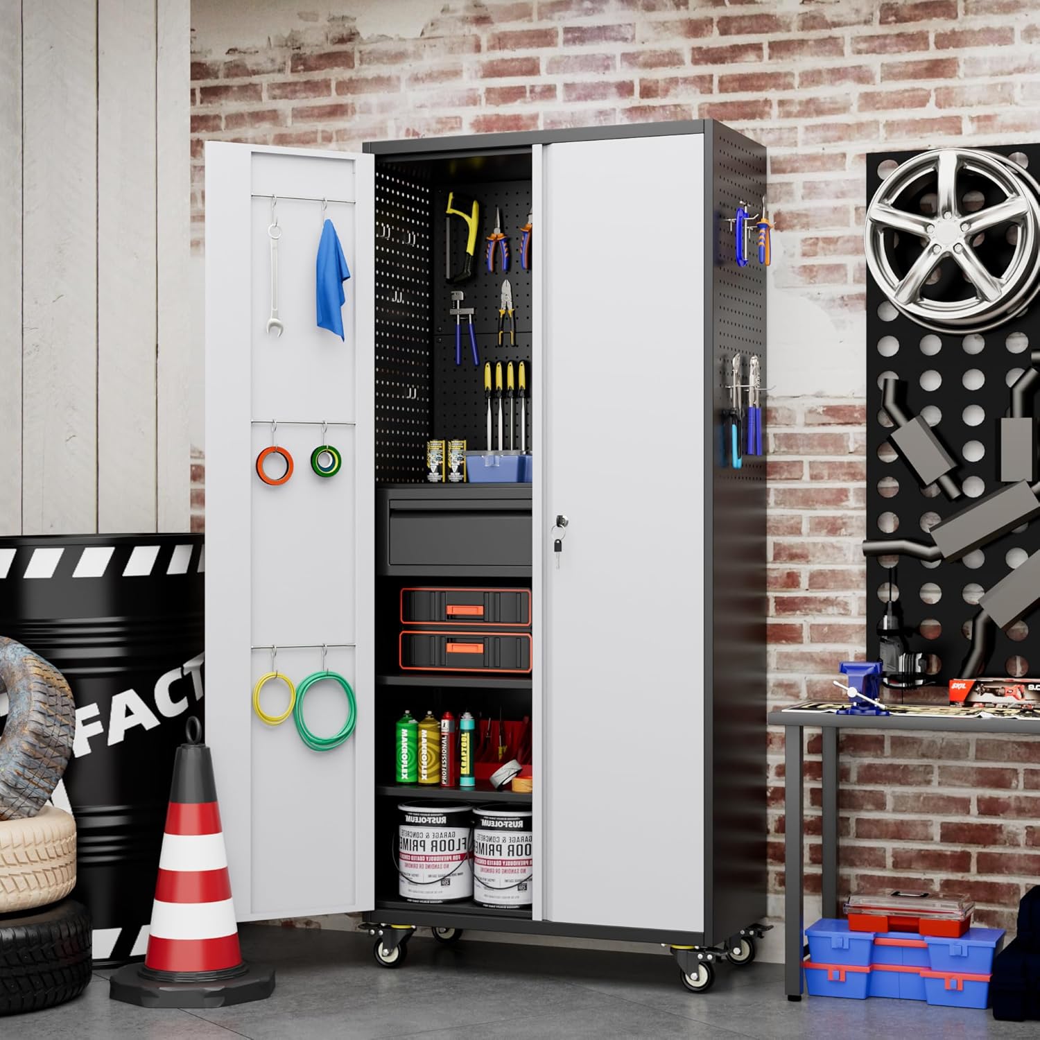 • 【2 Adjustable Shelves and Pegboards】 Locking cabinet on wheels has 2 adjustable shelves and pegboards. The shelves can be adjusted up and down to the desired position for your household items, tools, and other items. When you do not want to use the hole plate in the back to hang the item, you can lay it flat as a partition to place the item