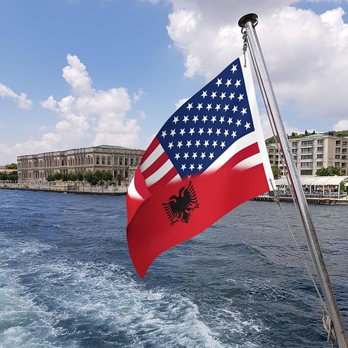• This 2x3 ft flag Vintage America Albania Albanian Flag banner is stitched double all around the edge and strengthened by two brass grommet to increase flag life and prevent fraying. Installation and disassembly are very convenient.