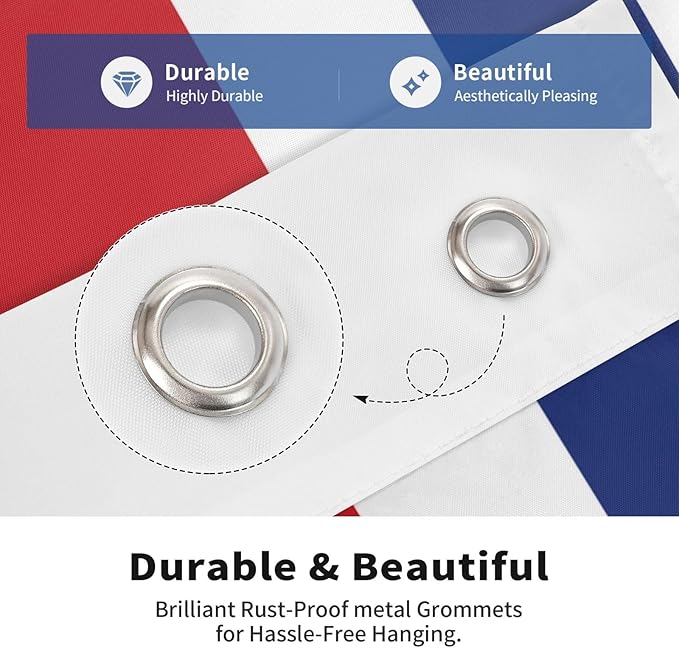 • This 2x3 ft flag Costarica Flag banner is stitched double all around the edge and strengthened by two brass grommet to increase flag life and prevent fraying. Installation and disassembly are very convenient.