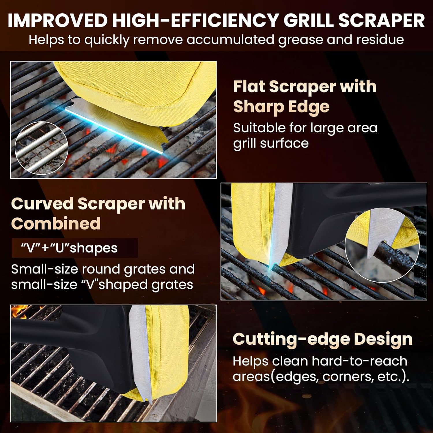 • 2. 【Professional Scraper & Heat-Resistant Brush】Built to Last Integrated stainless steel grill scraper for outdoor grill detaches for heavy-duty scraping. Paired with a 450°C-tolerant steel grill brush head, this barbecue grill brush doubles the lifespan of ordinary brushes.