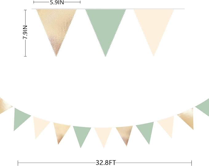 • Environmental Material -Our sage green beige champagne gold triangle flag pennant banner are made of double-sided champagne gold metallic fabric and sage green、cream beige cotton fabric,soft and comfortable touch,Unique wavy neat cut,safe and odorless,washable and waterproof,durable and reusable.