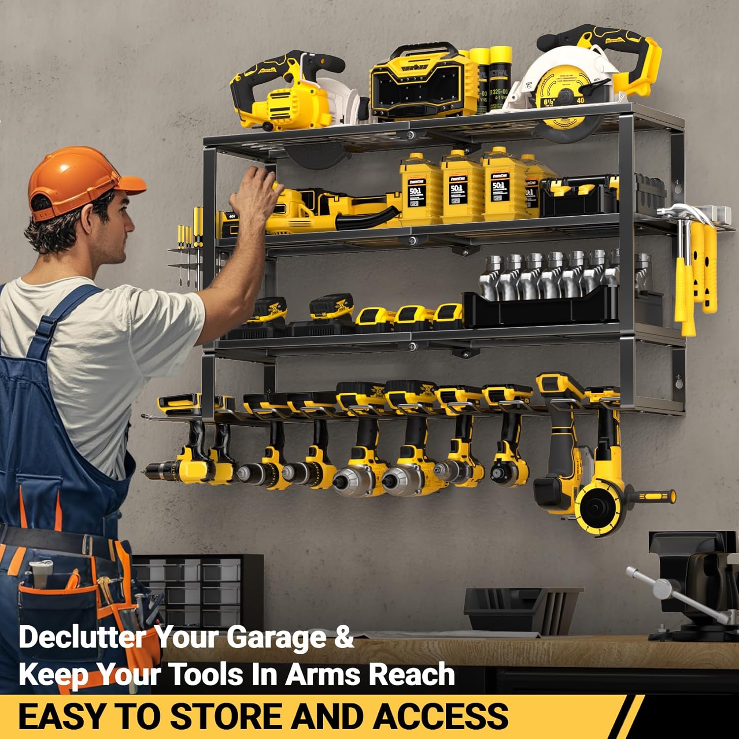 • 【Save Space & Boost Efficiency】Store up to 10 cordless tools on the bottom tier. The 3 top shelves for batteries, chargers, toolboxes, and large power tools. Side slots hold screwdrivers and hammers for quick access. Maximize unused wall space and keep all your tools in one organized, easy-to-reach place.