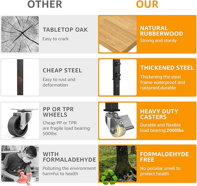 • Stable Construction&Convenient to move:The frame of the work table is made of cold-rolled steel plates, which are very sturdy.Several thick crossbars keep the table stable when loaded. With four heavy-duty 360° locking casters, moving becomes effortless, providing mobility for your workstation anywhere.Moreover, all accessories, required tools, and detailed installation instructions are included, making it easy to assemble the heavy-duty workbench.