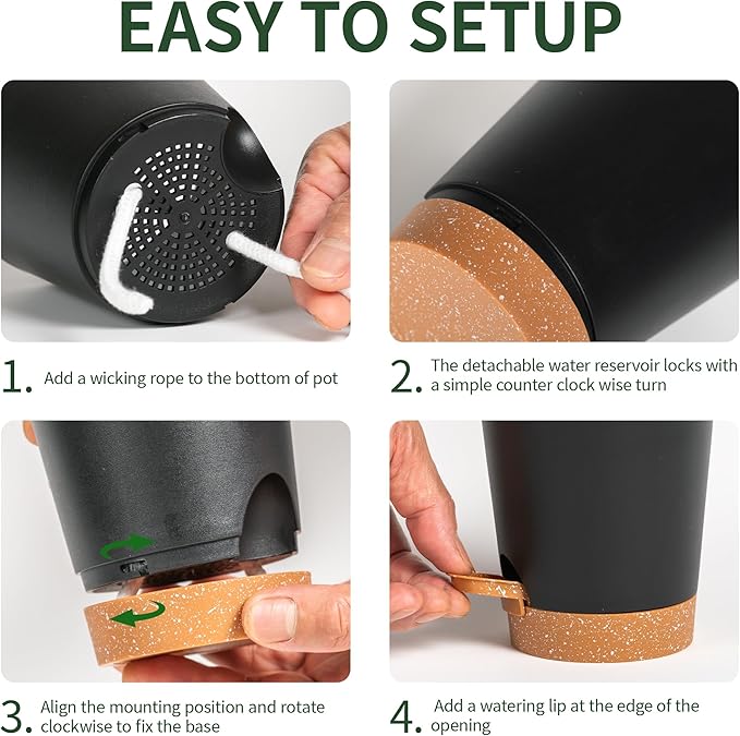 • Self-Watering Planter System: Our 4 inch small self watering plant pots feature a built-in wick rope that draws water from the reservoir, ensuring consistent hydration for your indoor and outdoor plants. Perfect for busy plant owners and those who forget to water!