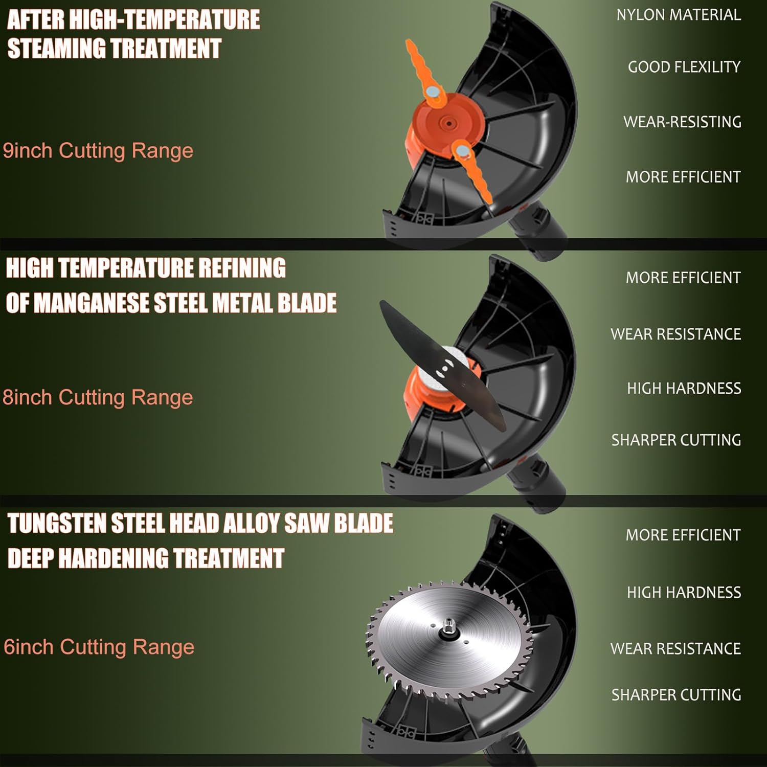 • Multifunctional Brush Cutter: 3-IN-1 cordless grass trimmer has different blades to meet different weeding needs. The upgraded plastic blades are suitable for trimming soft lawns(battery grass trimmer); 8-inch stainless steel blades are well for older weeds, reeds, etc pruning(stringless weed trimmer); Alloy saw blades are great for branches, etc cutting(cordless brush cutter). The electric grass trimmer battery powered is ideal for trimming around yards & bushes, lots, flower beds, and walkways
