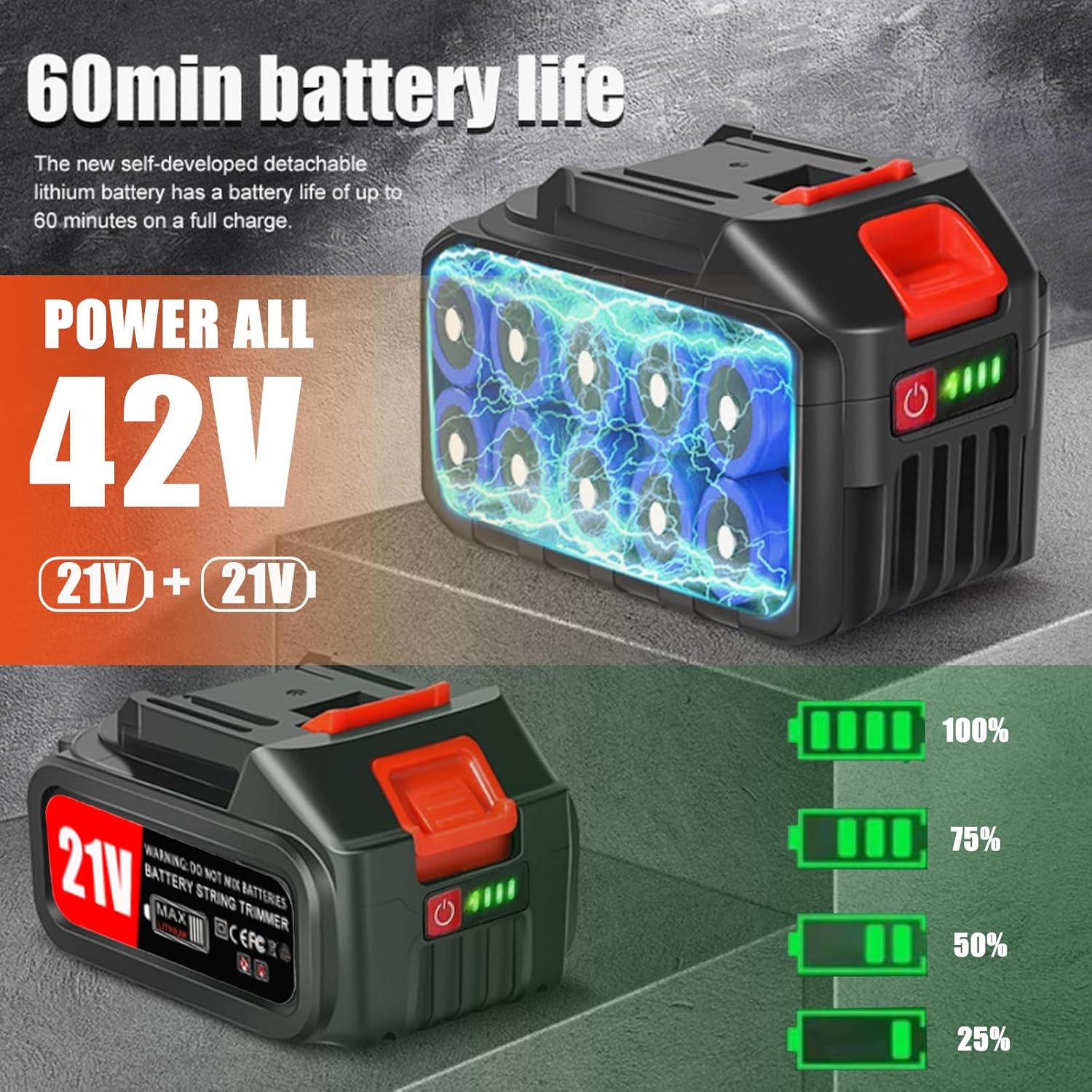 • 21V Battery Weed Wacker: This electric grass trimmer include 2pcs high capacity battery battery and fast charger that can provide super use life (1-2hour), You can use the 2 batteries alternately to provide continuous power for outdoor work. so you can trim more weeds in yard. Quieter, safer, more environmentally friendly and portable than gas or corded string trimmer, you can saves resources and money
