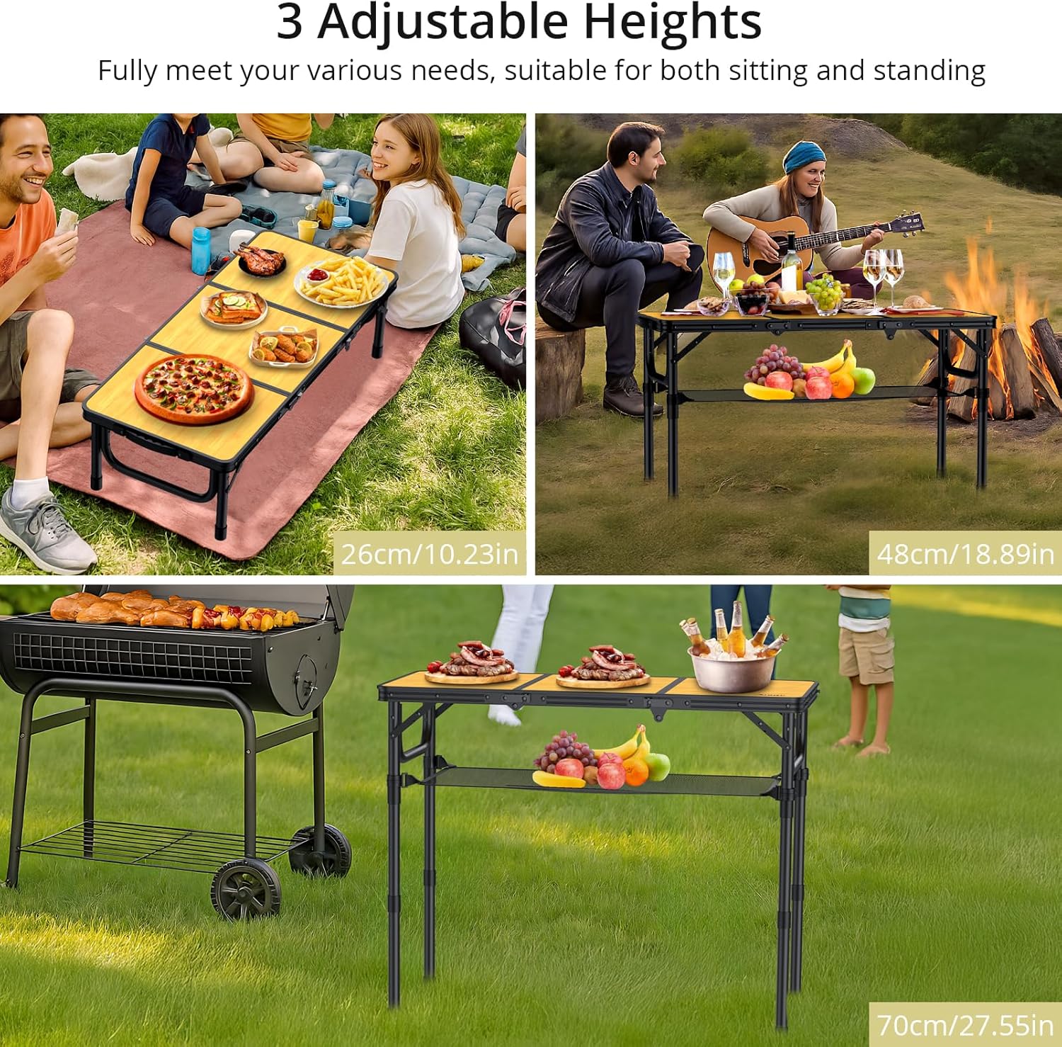 • 3 Heights with Adjustable Legs: You have 3 fixed length for the legs of the table with a height of 10, 19 and 27.5 inches (26, 48 and 70cm). You can sit on the lawn when picnic with the lowest height. Or you can siting beside the table with chair when adjusted to the highest height