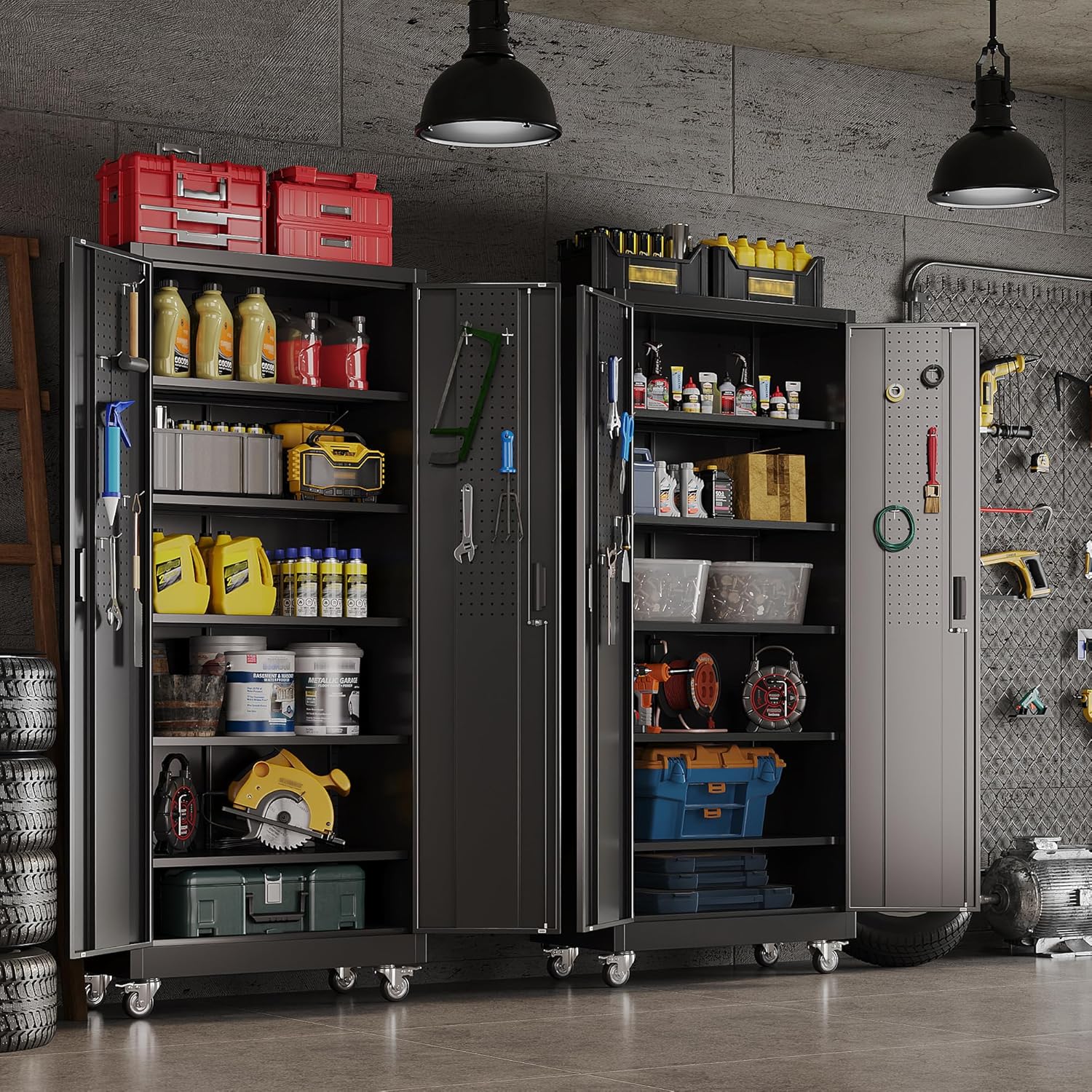 • Metal Storage Cabinet : Metal storage cabinet has 5 adjustable and removable shelves that can be adjusted while ensuring maximum adaptability and convenience to meet your own unique storage and organization needs. Metal storage cabinet have 2 round pegboards and 4 hooks, and if you need more you can easily buy more suitable hooks