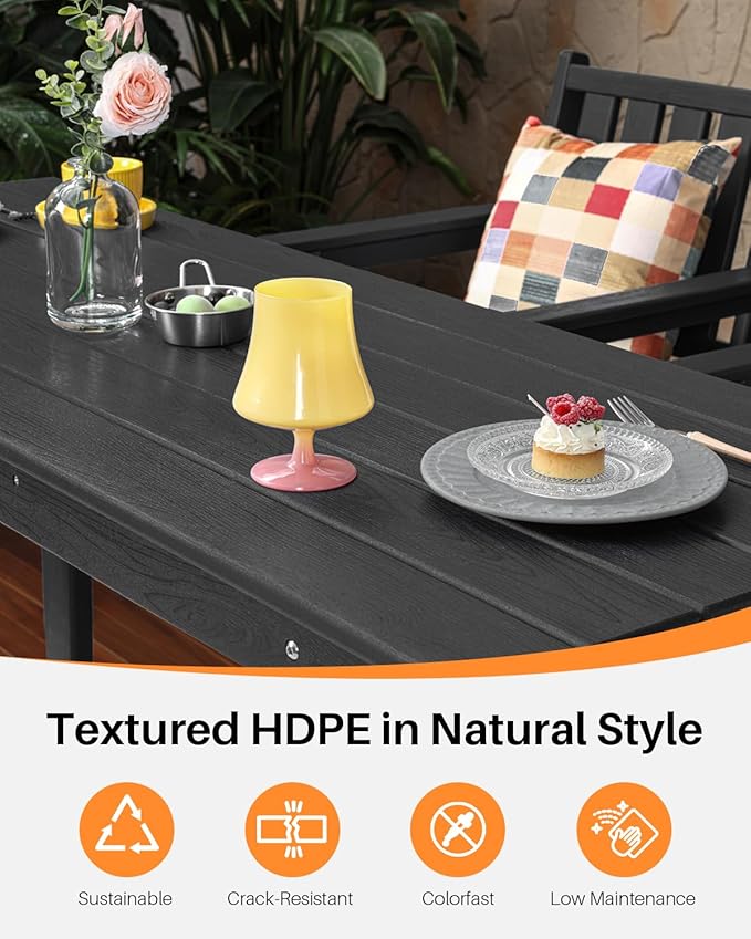 • Durable HDPE Bar Stool Set for Year-Round Use: This Obsidian 3-piece patio bar set includes two Adirondack-style HDPE bar stools and a matching 60"L x 22"W x 41"H rectangular outdoor bar table. Made from premium HDPE lumber with an authentic woodgrain finish, this set resists fading, cracking, and moisture damage—ideal for balconies, patios, pool decks, or outdoor bars throughout all seasons.