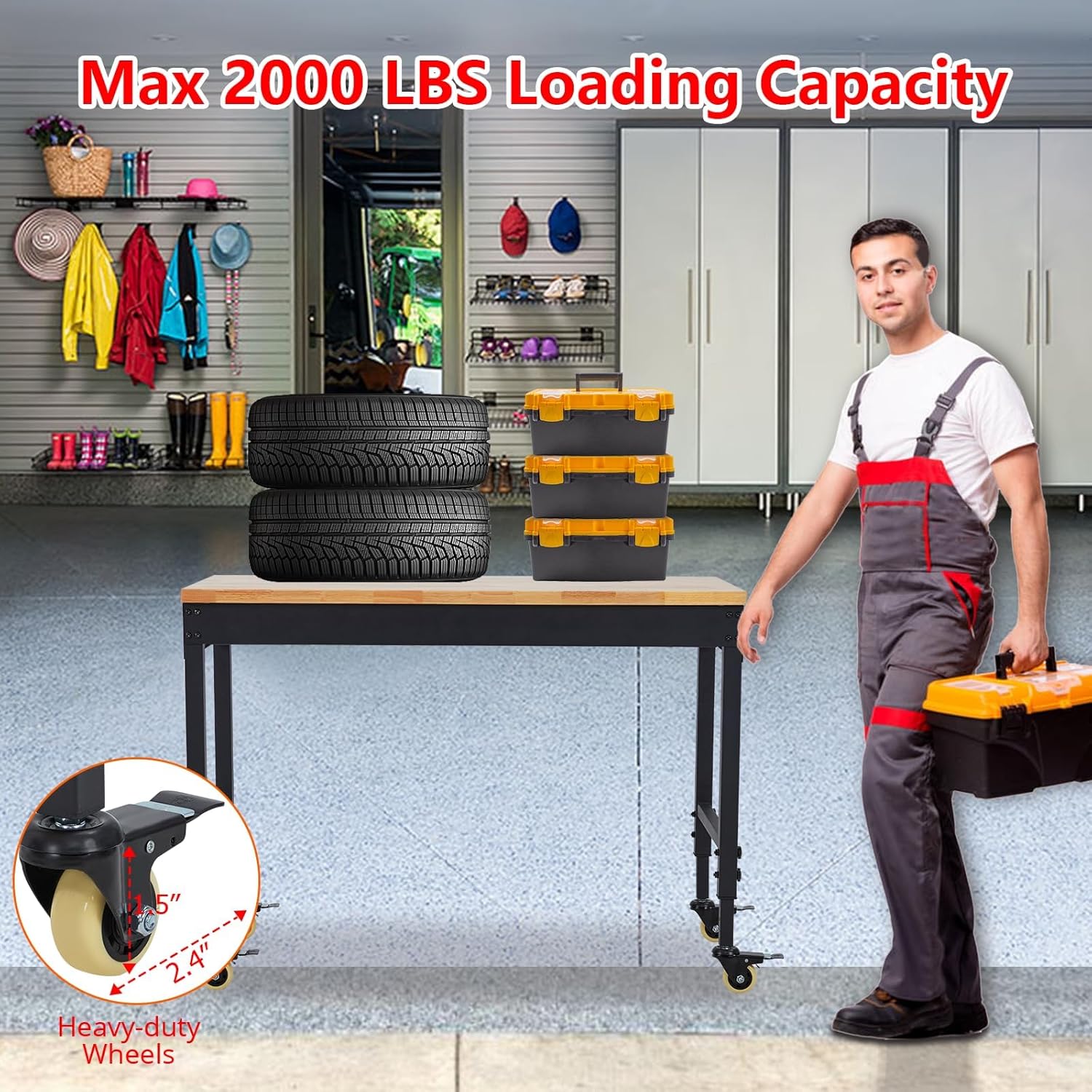 72" x 25" Heavy-Duty Adjustable Workbench with Power Outlets - 2000LB Capacity Garage Workbench, Rubberwood Top, Locking Wheels, Mobile Workstation for Workshop, Office & Home