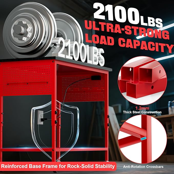 • Ultra-Stable 2100LB Heavy Duty Workbench with Reinforced Frame: This professional garage workbench features a patented bottom crossbar design that eliminates wobbling - unlike competing work tables that shake under load. The industrial-grade steel frame and MDF top deliver unmatched 2100lb capacity, making it ideal for workshop table applications requiring rock-solid stability
