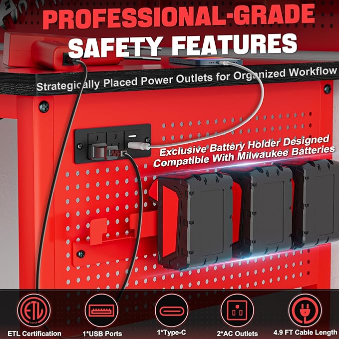 • ETL-Certified Power Hub with Modern Charging (2AC + 1USB-A + 1USB-C): Stay productive with the built-in power strip featuring 4.9FT cord length. Perfect for workbenches for garage use, it safely powers tools while the USB-C port future-proofs your workspace. ETL certification guarantees worry-free operation