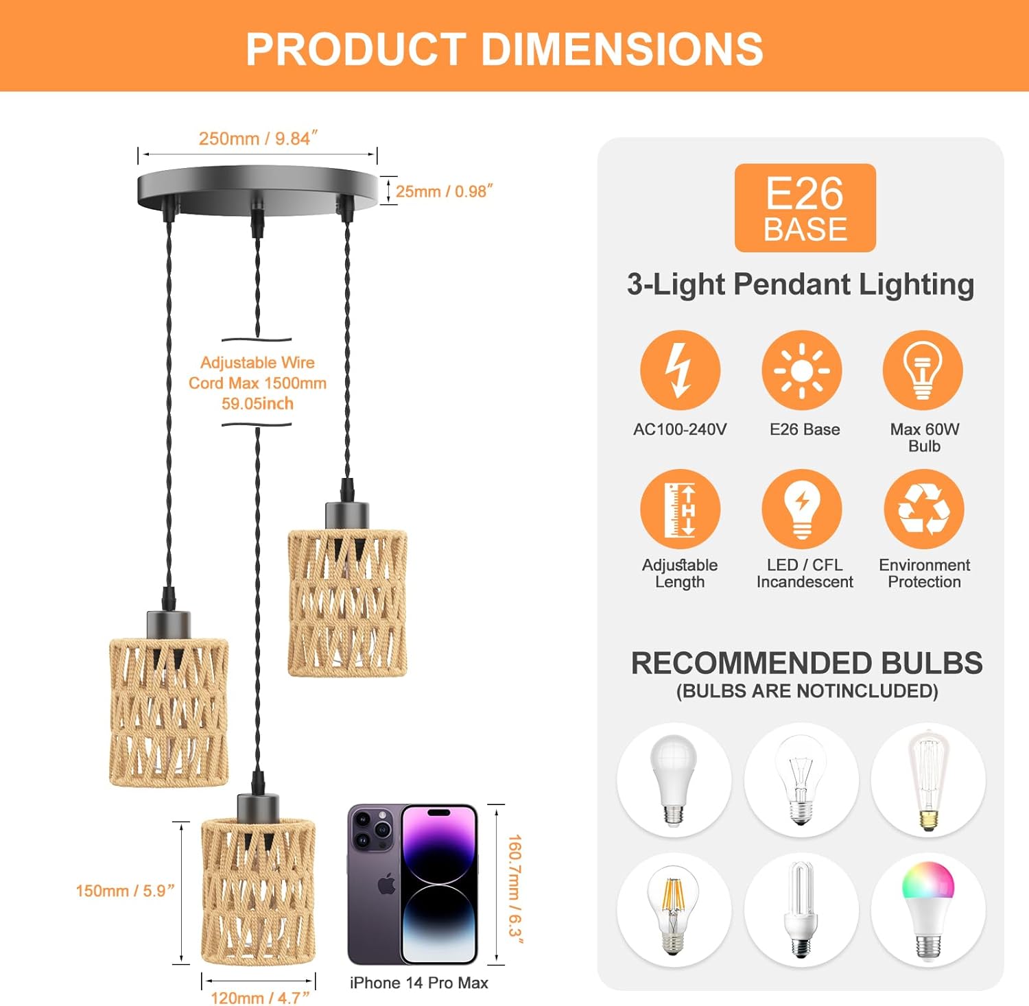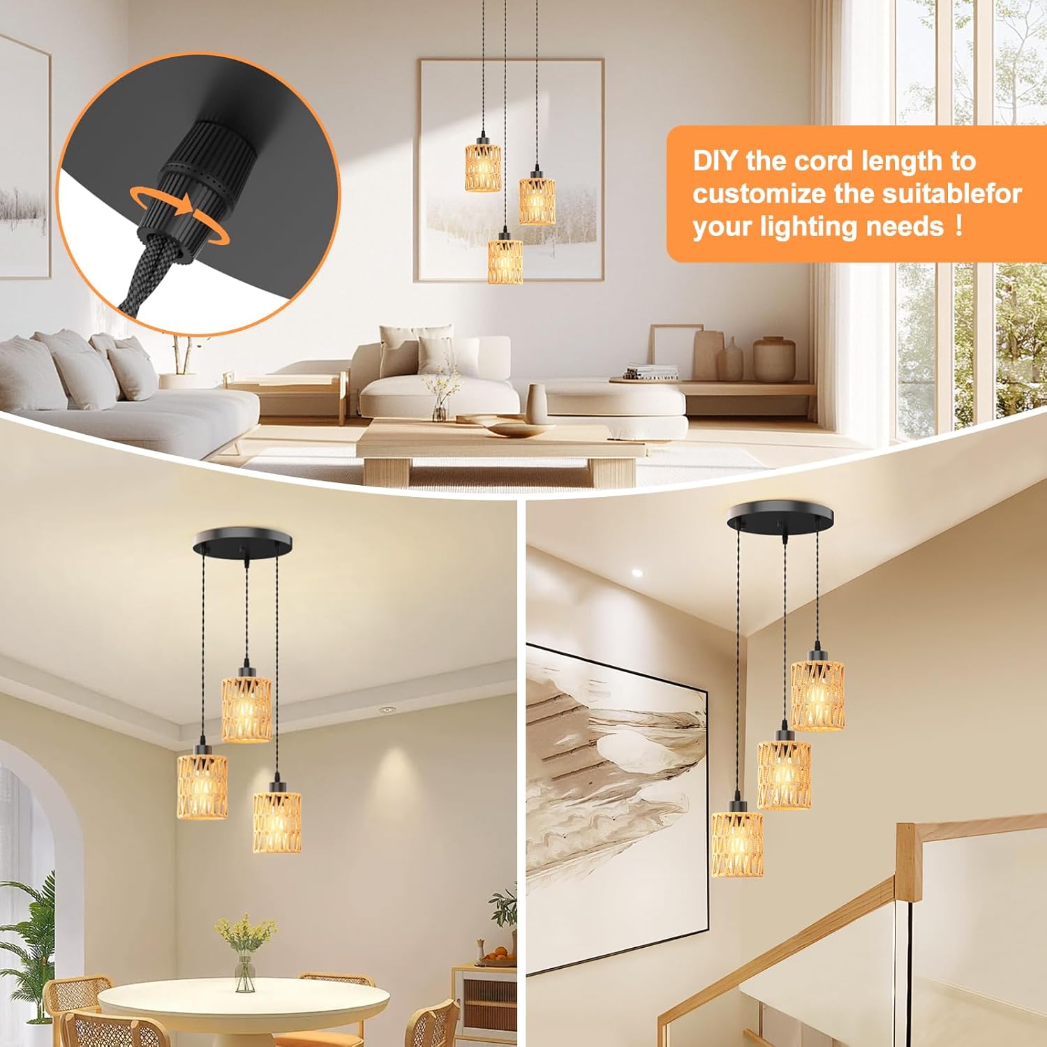 3 in 1 Farmhouse Hemp Rope Pendant Light - Rustic Hand-Woven Rattan Hanging Light Fixture for Kitchen Island,Dining Room,Bedroom- Wicker Cage Chandelier-Coastal/Nautical/Boho Style Lighting Fixture