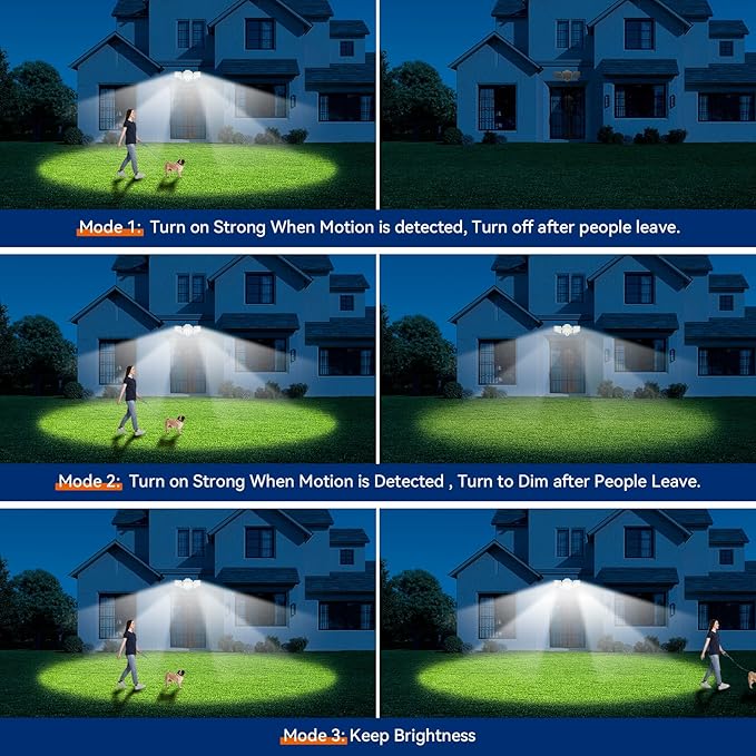 • ๐Ÿ“ ๐‹๐ข๐ ๐ก๐ญ๐ข๐ง๐  ๐Œ๐จ๐๐ž๐ฌ ๐Ž๐ฎ๐ญ๐๐จ๐จ๐ซ ๐‹๐ข๐ ๐ก๐ญ : The outdoor floodlight features four versatile lighting modes: โ‘  Motion-activated at 100% brightness during the night; โ‘ก Dim light sensor mode โ‘ข Always-on at 30% brightness at night โ‘ฃ Stays on at 70% brightness at night โ‘ค Stays on at 100% brightness at night . These modes accommodate various usage scenarios, making it suitable for outdoor applications such as garages, yards, porches, pathways, driveways, and swimming pools