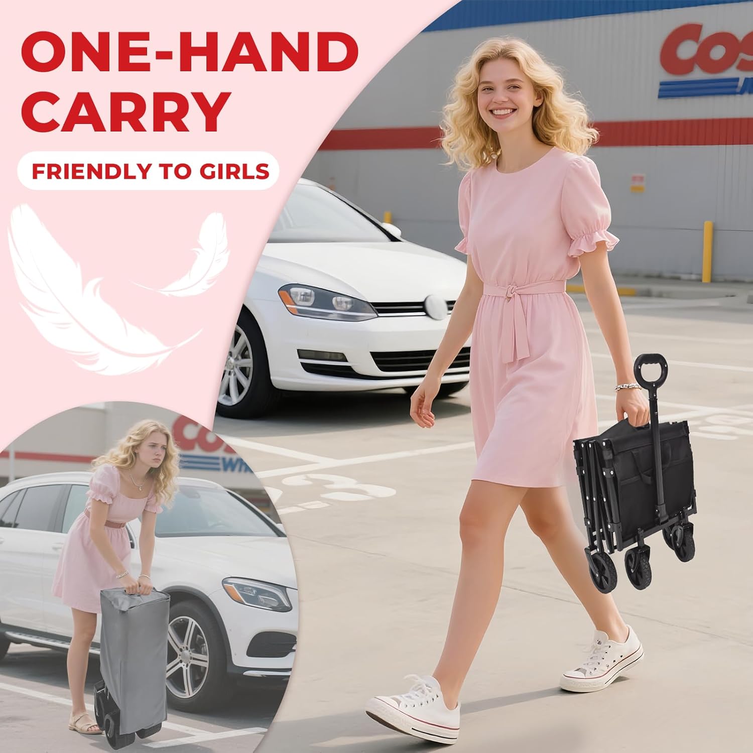 • Ultra-thin Storage Size:When folded, it measures just 16.93 × 6.89 × 25.59 inches—50% smaller than most wagons on the market. It is extremely convenient to store and saves space, fitting neatly into apartment cabinets, car trunks, patio corners, and any other narrow spaces. No more worries about storage