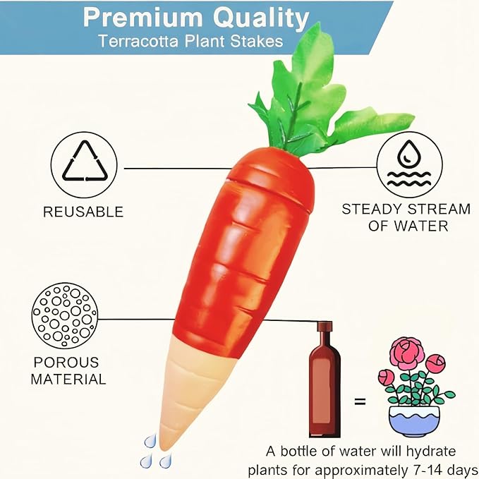 • Cute carrot shape: This plant terracotta watering stake is designed in a round and full carrot shape, with a few three-dimensional green leaves on the top, which instantly brightens the cuteness of the potted plants, full of natural childlike fun, making your plants more vibrant. It is not only a practical irrigation tool, but also a gardening ornament for windowsills and desktops