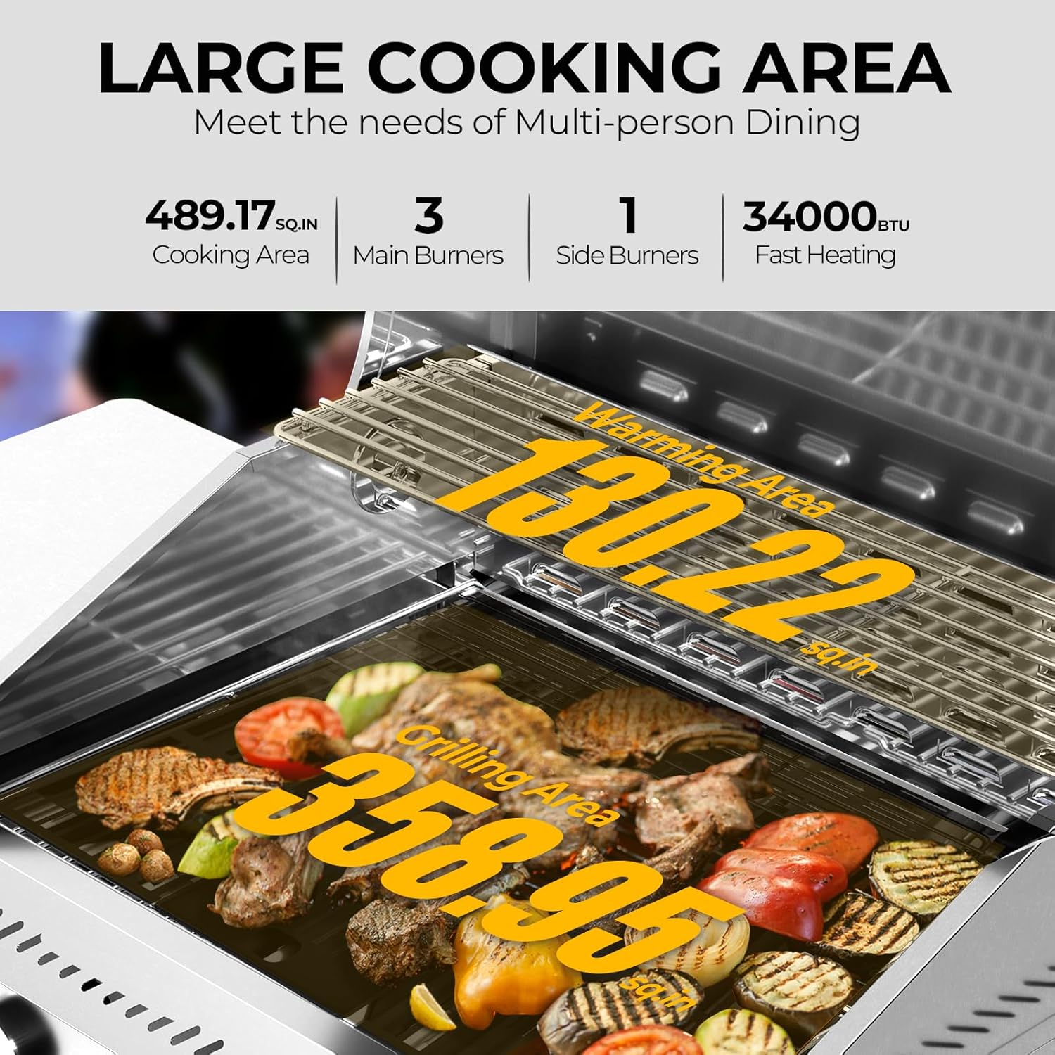 • Spacious Cooking Area & Storage : Offers 489.17 sq. in. total grill space (358.95 sq. in. main grilling + 130.22 sq. in. warming area). Built-in bottle opener, side hooks for tools, and bottom storage keep everything organized.