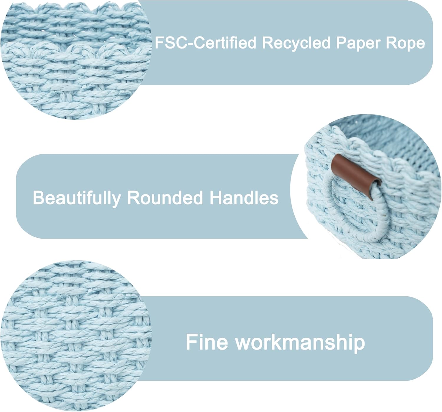 • HANDCRAFTED WITH SUSTAINABLE MATERIALS - Made with the strength of FSC-certified recycled paper rope, each delightful storage basket is enhanced with the soft elegance of vegan leather trimmings. The large basket also features beautifully designed circular handles on both sides. This perfect combination of style and functionality not only brightens your living space but also reflects our commitment to sustainability in a modern and stylish way.