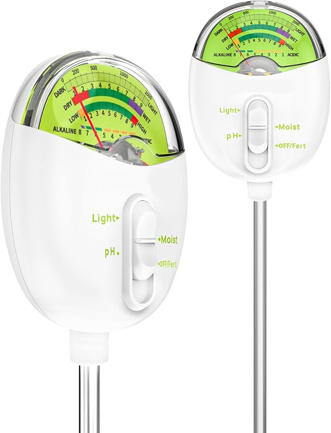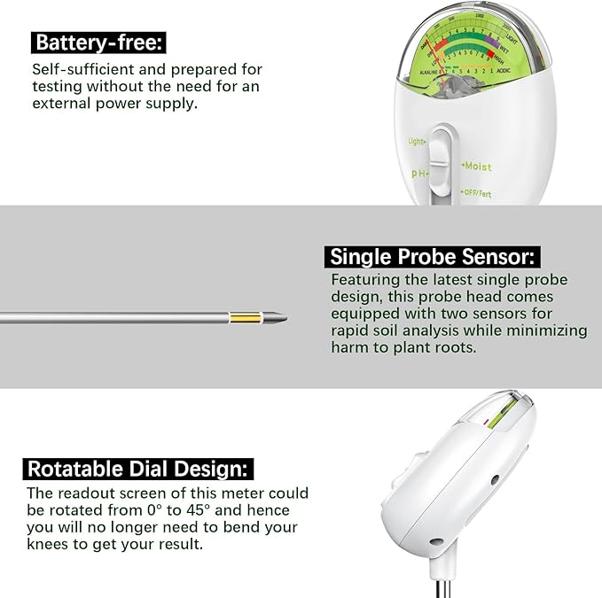 • Precise and Durable Sensor Design: Built with a corrosion-resistant, upgraded stainless steel probe, this soil test meter ensures reliable performance and accurate readings. Quickly detect essential factors like acidity, moisture and fertility to guide your plant care routine effectively