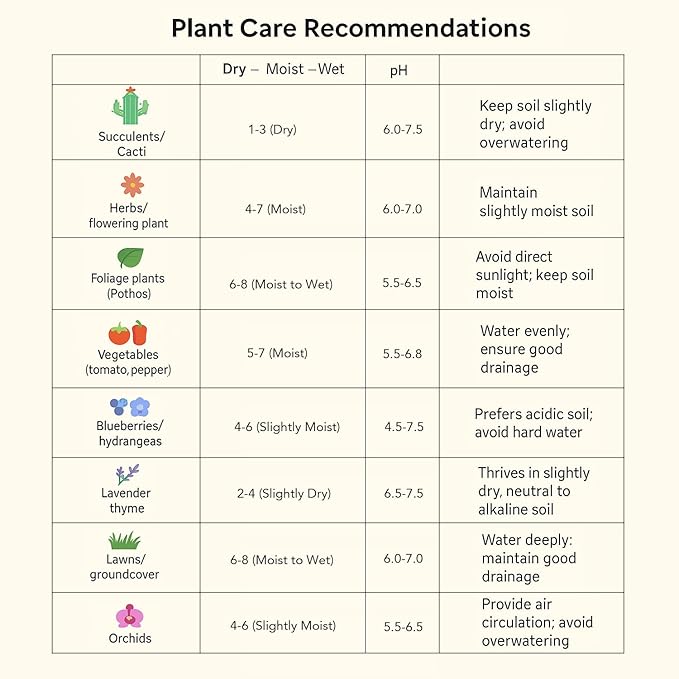 • Usage Tips & Friendly Support: Avoid testing dry or hard soil directly and lightly moisten soil before use to protect the sensor. Not suitable for testing liquid solutions. Backed by U.S. design and technology patents, we offer responsive customer service to ensure your satisfaction