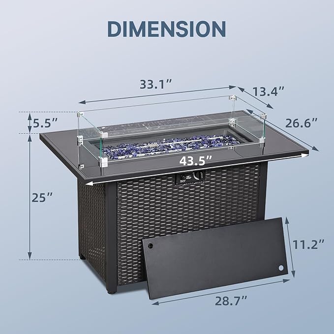 • 60,000 BTU CSA-Certified Fire PitTable: Elevate your outdoor gatherings with our 43" propane fire pit table, engineered to deliver up to 60,000 BTUs of comforting heat—perfect for extending your backyard evenings well into cooler seasons. The stainless steel lid doubles as a functional dining surface, seamlessly transitioning from fire pit to table. Please note that the gas tank and propane should weigh less than 20 pounds, and the gas tank itself is not provided