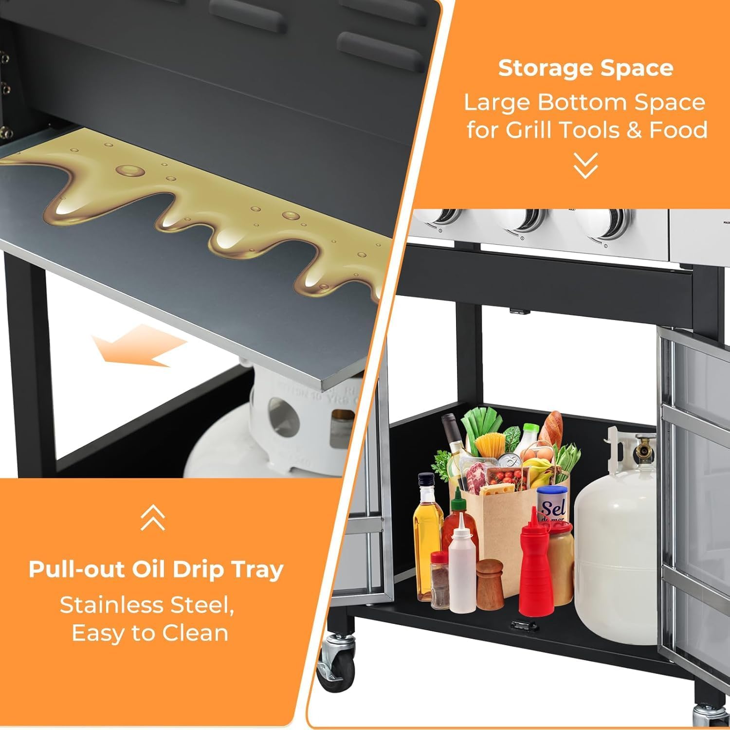 • 【Strong Heat Output】This outdoor gas grill features 4 main burners and 1 side burner, offering total 47,000 BTU for versatile cooking. The main burners are suitable for grilling, while the side burner is ideal for cooking pots