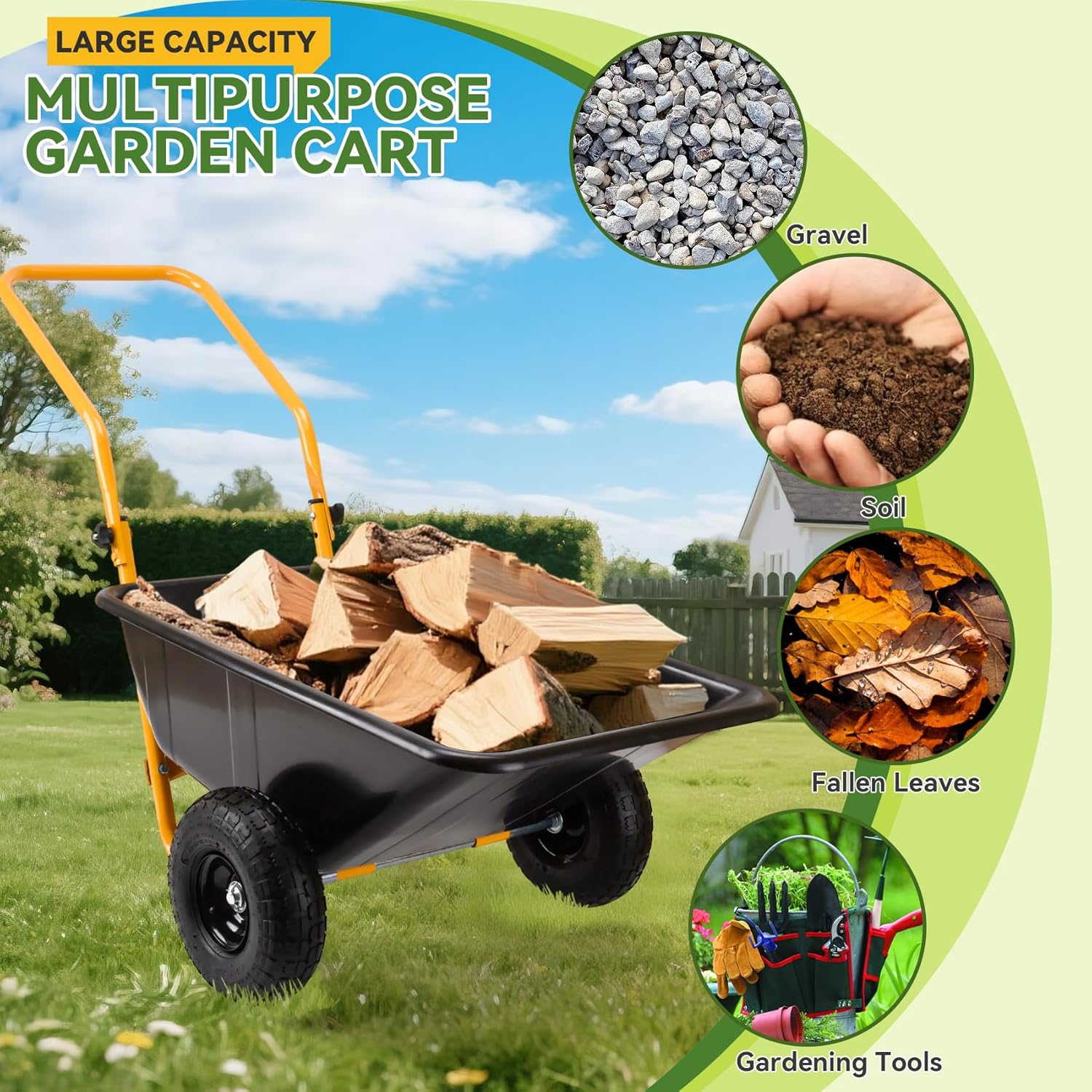 • Large 21-Gallon (80L) Volume for Bulk Hauling:With a spacious 21-gallon (80L) capacity,this wheelbarrow is perfect for transporting large quantities of mulch,firewood,gravel,or compost in a single trip.The deep,sturdy bin minimizes spillage,while the wide opening allows easy loading and unloading of bulky items.Ideal for landscapers,gardeners,and DIY enthusiasts.