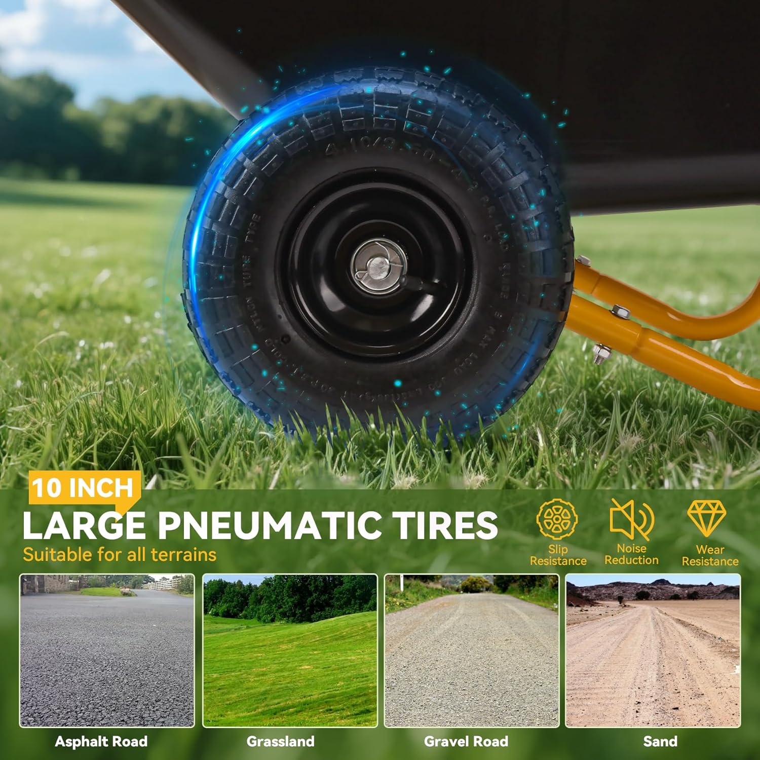 • Heavy-Duty Dual Pneumatic Wheels for Smooth Mobilit:Equipped with 10-inch (26 cm) pneumatic tires,this wheelbarrow ensures superior shock absorption and traction on rough terrains like gravel,sand,grass,and uneven pavement.The air-filled tires reduce noise and rolling resistance,making it effortless to transport heavy loads.The dual-wheel design enhances stability,preventing tipping even on slopes or bumpy ground.