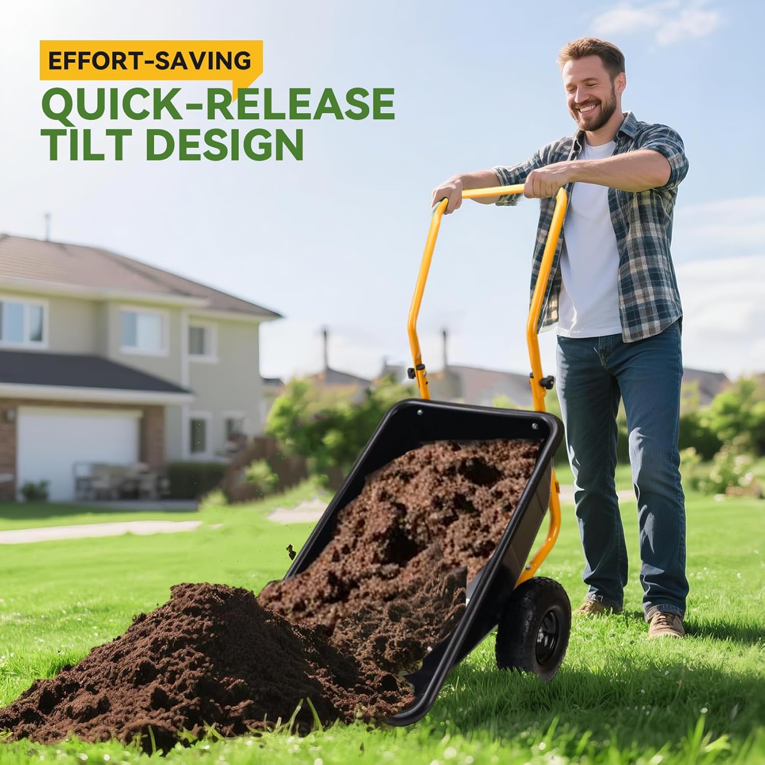 • Quick-Release Tilt Mechanism for Effortless Unloading:The one-handed quick-release lever enables smooth,controlled dumping of contents without heavy lifting.Simply pull the lever, and the bin tilts forward,making it perfect for repetitive yard work, construction sites,or farm use.The hassle-free design saves time and reduces physical strain.