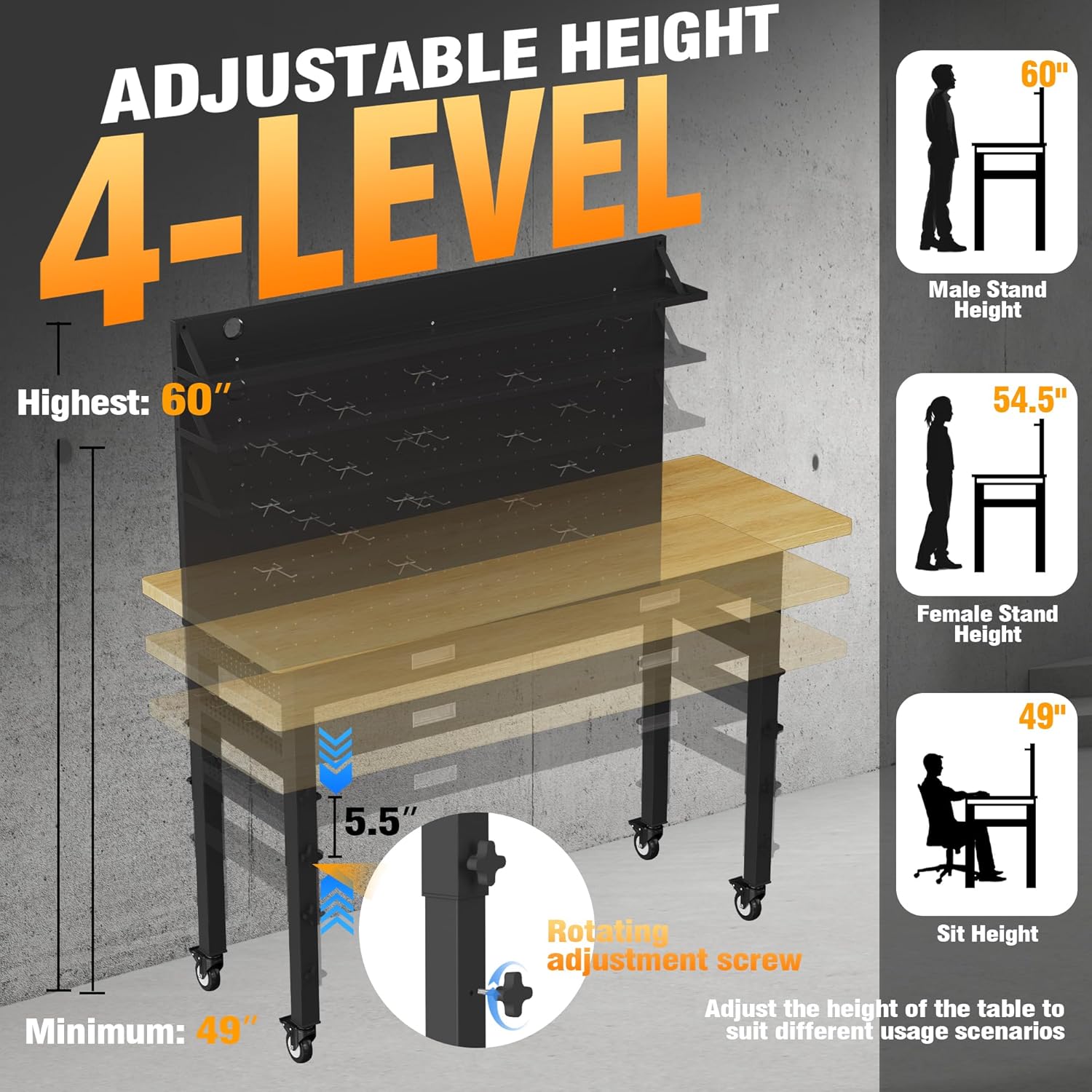 • Multi-Level Height Adjustable: Without additional tools, the workbench can be adjusted to 4 different heights from 39" to 60", allowing you to work more comfortably standing or sitting, preventing you from staying in the same position for a long time