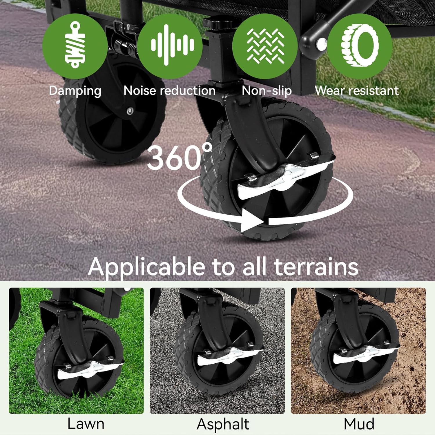 • High-quality materials & sturdy structure:This folding wagon cart features a reinforced steel frame and 600D waterproof Oxford fabric for durability. Equipped with thickened springs and 360° rotating front wheels with brakes, it offers easy maneuverability on any terrain, making it a reliable all terrain wagon.The tires and Oxford cloth are designed to be detachable, making cleaning and storage a breeze