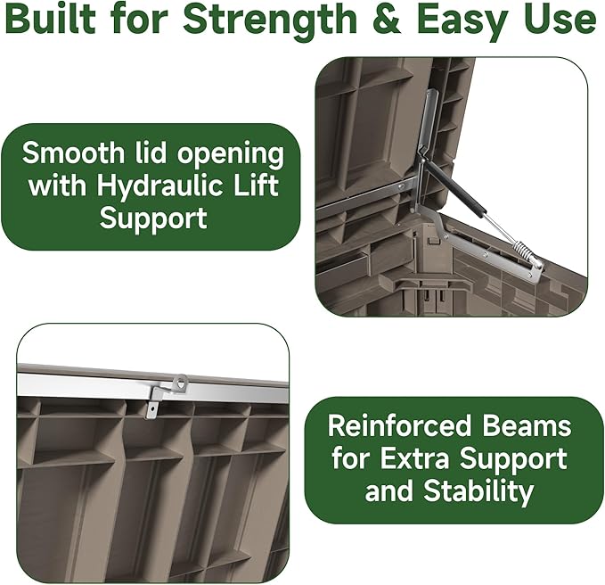 • SAFETY & LOCKABLE DESIGN - Equipped with a hydraulic rod, this storage box ensures smooth and safe lid operation, preventing accidental pinching. The built-in lockable design provides an additional layer of security, keeping your outdoor valuables safe and protected.