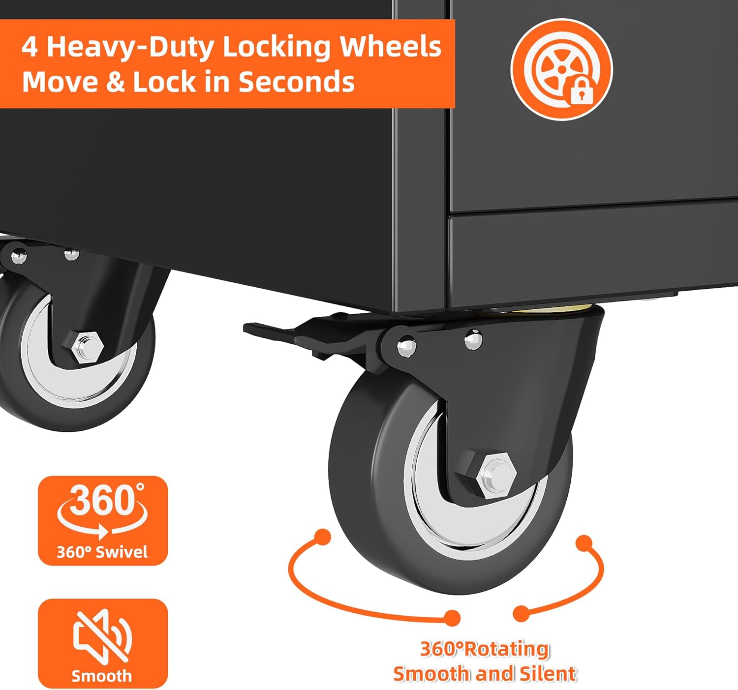 Aobabo Metal Storage Cabinet with Wheels and 2 Locking Drawers, Steel Rolling Tool Cabinet with 8 Hooks and 2 Adjustable Shelves for Garage, Home, Office, Kitchen, Assembly Required, Black