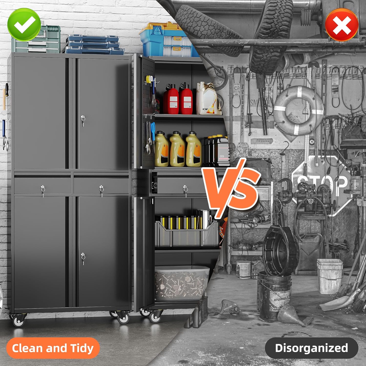 • 【2 Adjustable Shelves】 Locking cabinet on wheels has 2 adjustable shelves. The shelves can be adjusted up and down to the desired position for your household items, tools, and other items. this tall metal cabinet also has an interior design that adds extra space to any room