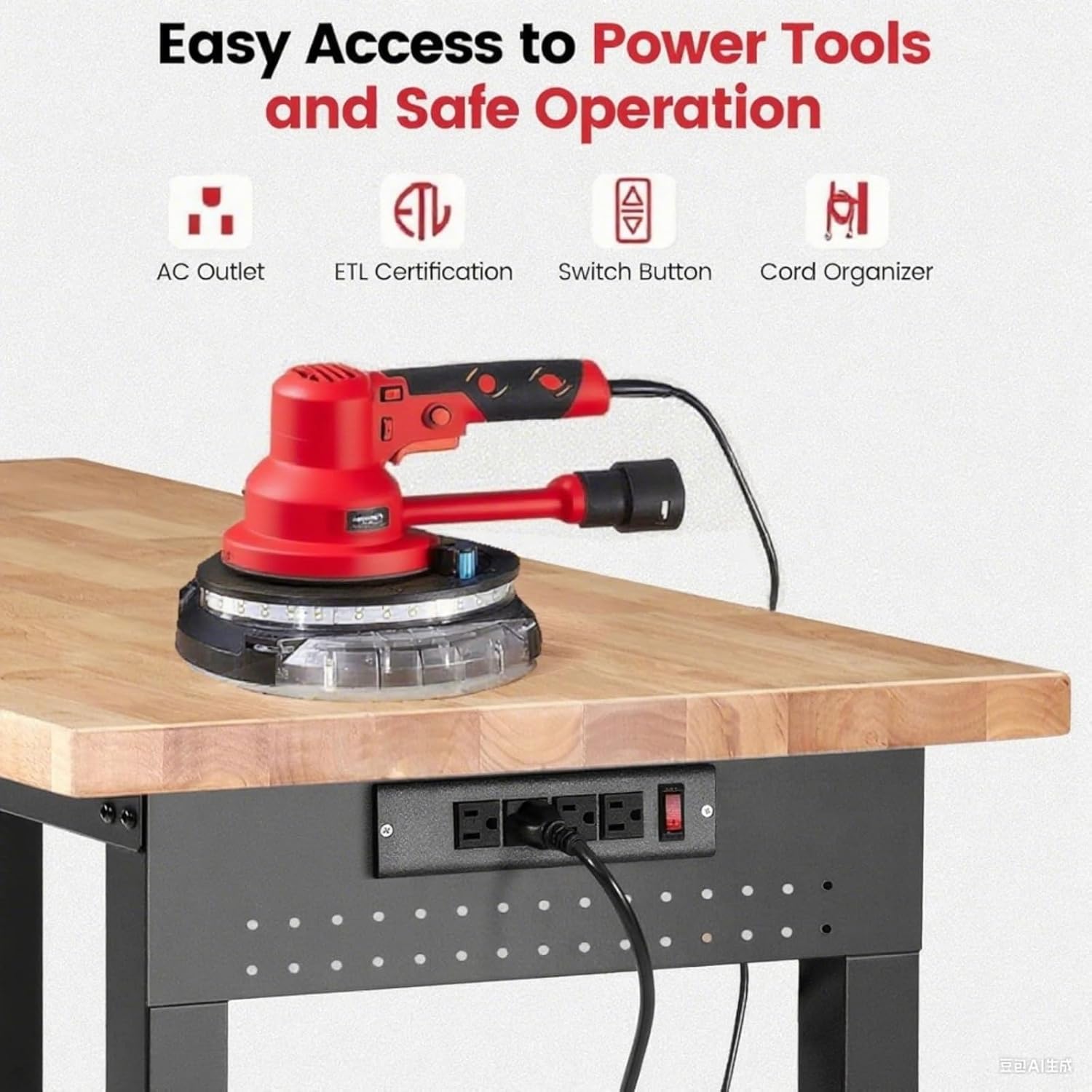 • Additional Storage & Functionality: â‘ Dual-sided pegboards keep tools organized and within reach. ②Under-table shelf (500lbs capacity) adds extra storage space. ③ETL-certified power outlets and cord organizer allow easy use of power tools and tidy cable management.