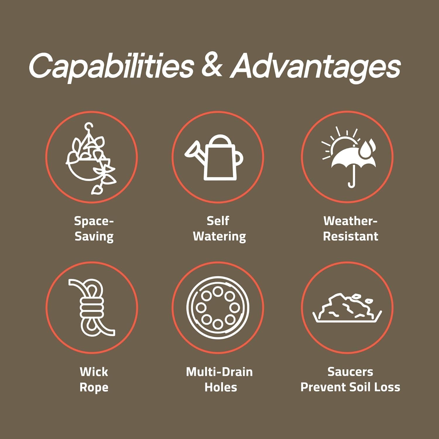 • LOW-MAINTENANCE CARE – Heading on vacation? These self watering hanging pots got you covered. The deep reservoir & watering rope keep your plants hydrated for weeks. Each pot also features a convenient watering lip for easy top-ups without unhooking.