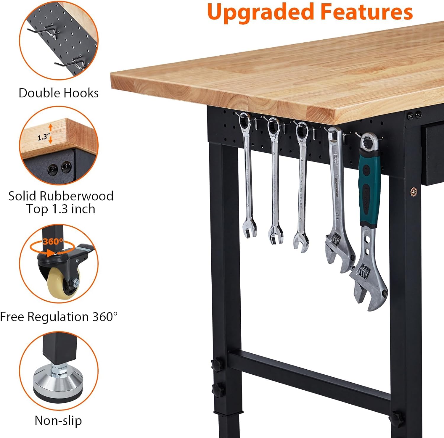 • 【Solid Rubberwood and Thick Steel Leg Construction】Coating and Durability: Finely coated and polished for long life and easy cleaning. 1.3mm thick steel frame for robust support. Supports up to 2000 lbs, ideal for heavy-duty tasks like auto repair and gardening.