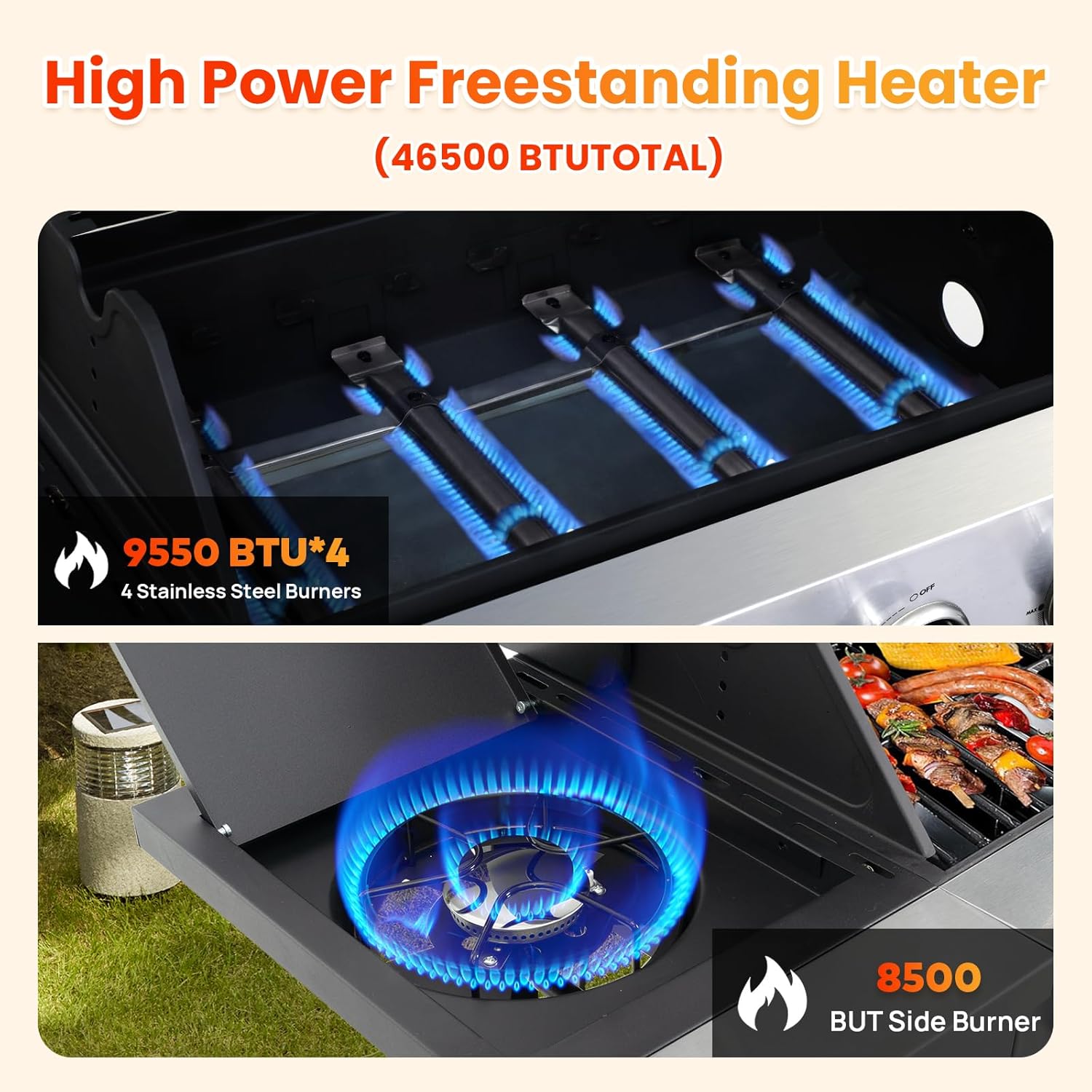 • 🔥 High-Performance Stainless Steel Burners - This propane gas grill features 4 powerful stainless steel burners and side burner delivering a total of 46,500 BTU per hour. With a built-in piezoelectric ignition system, you can enjoy instant start-up—just push and turn the control knob. It’s reliable, efficient, and ready to fire up your outdoor meals in seconds.