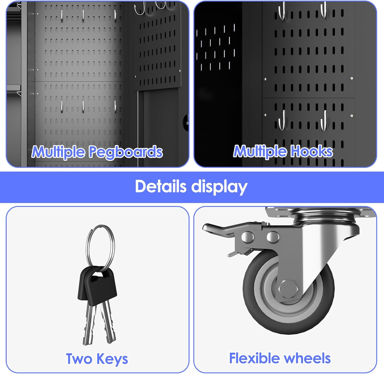 Garage Storage Cabinet with Wheels, 61.7" H Broom Closet Storage Cabinet with Hanging Rod, 5 Pegboard and 13 Hooks, Metal Cabinets with Locking Doors and 4 Shelves, Black