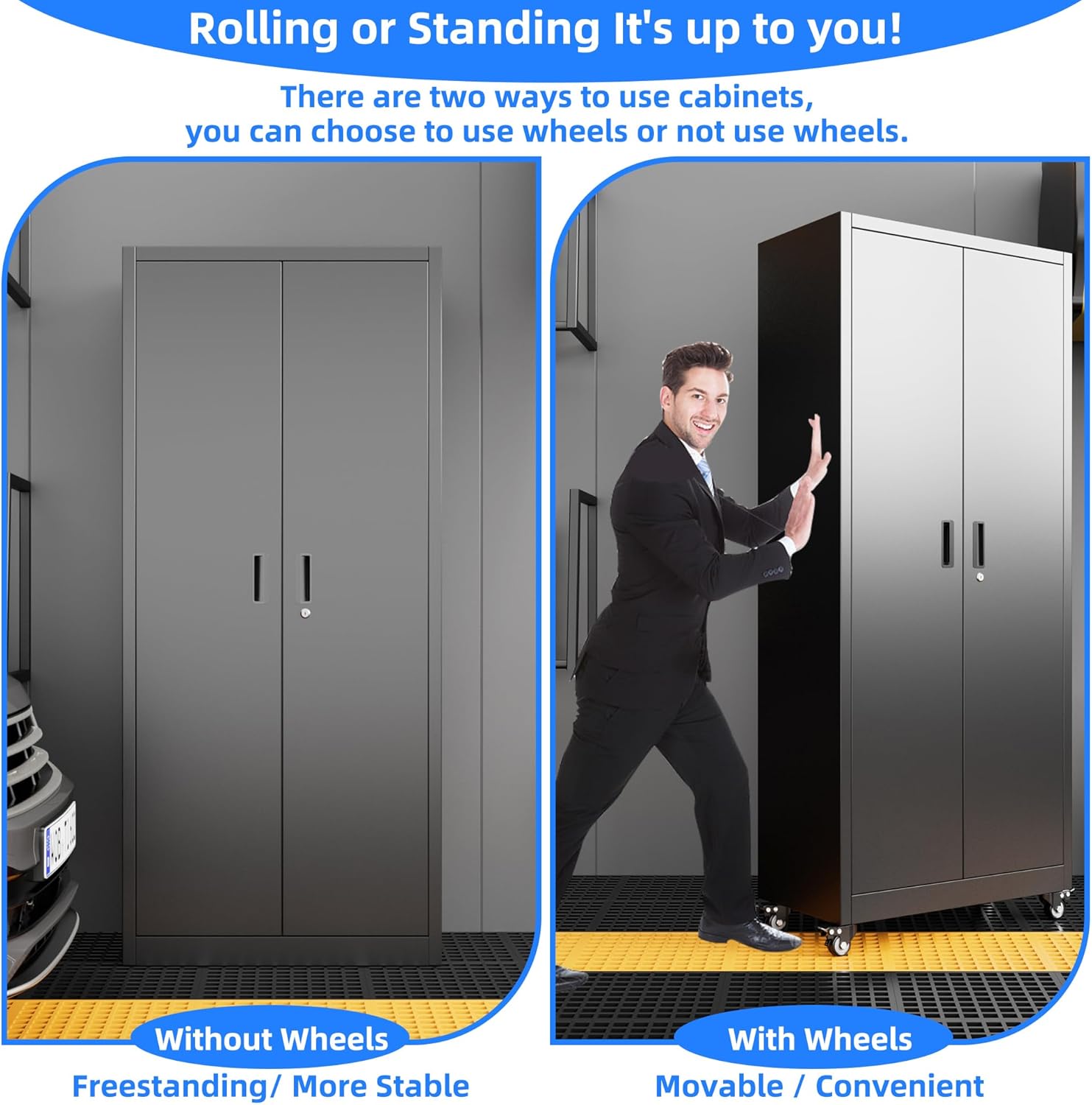 • Premium High-Quality Material Construction: Crafted from anti-rust, scratch-resistant metal, this garage storage cabinet with wheels ensures long-lasting durability and a sleek appearance. The environmentally friendly coating protects against corrosion and wear, making it ideal for garages, basements, or home offices while prioritizing safety and sustainability;