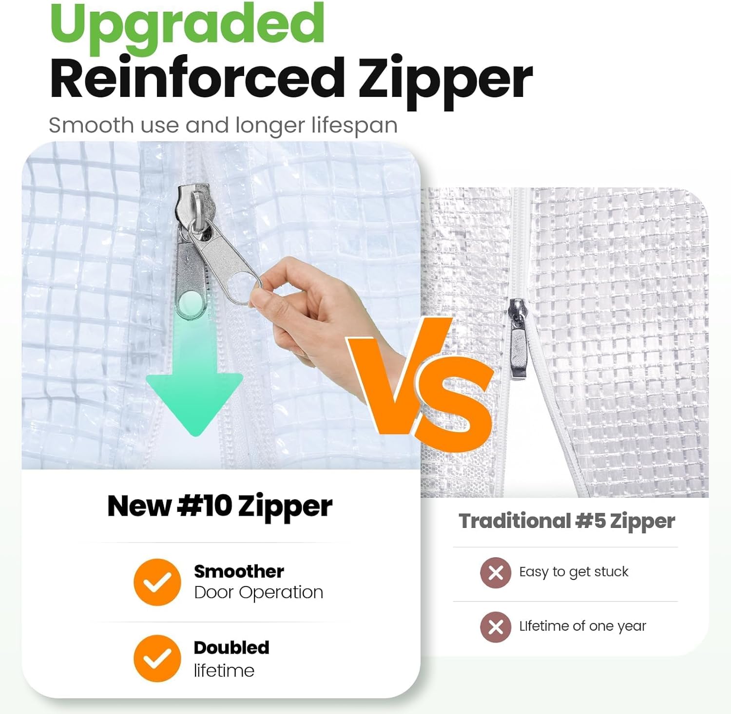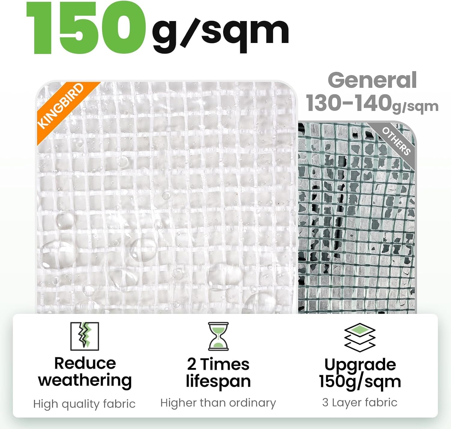 • [UVI 6 Protected Cover]--Waterproof 150g/sqm PE grid cover is UV Index 6 protected, protects your plants from excess rays, which doubles the service life: Compared to other greenhouse(UVI 1-3) that only lasts for 1-6 months, the KING-cover lasts for over years. The reinforced odorless PE covering material provides safe work zone. The cover fits the frame closely, enhancing warmth and wind resistance.
