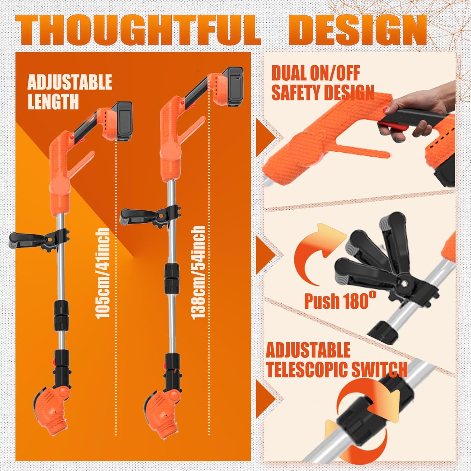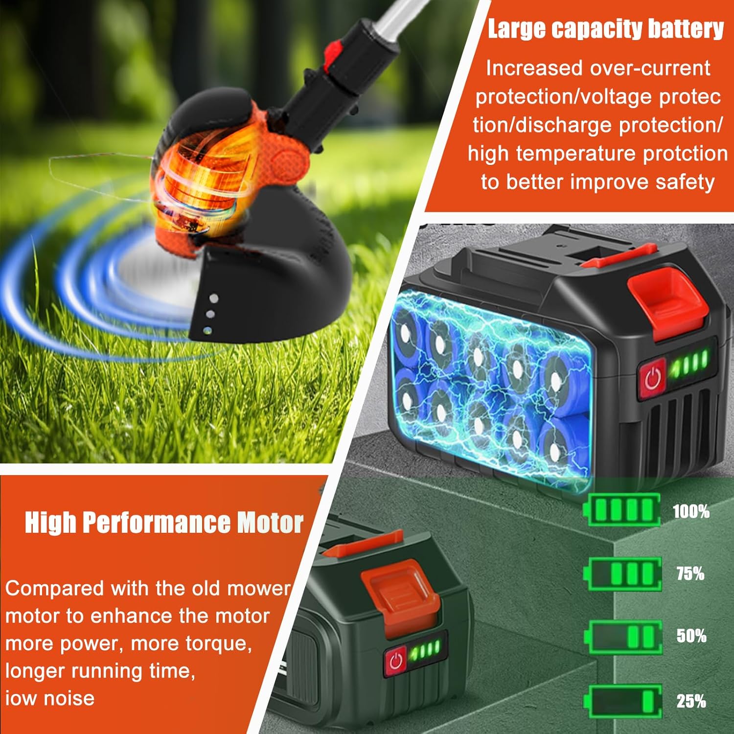 • 【2025 New Upgraded Electric String Trimmers】Our weed wacker battery operated has passed the professional design and safety test. The weed trimmer has been upgraded with smoother wheels, a larger mowing area, higher-strength blades and larger-capacity batteries. And it is 25cm longer than the old stringless trimmer, so you can trim without bending over. And we also come with a weed puller tool, so you can solve the trouble of weeds at one time. Make your lawn and garden perfect and tidy