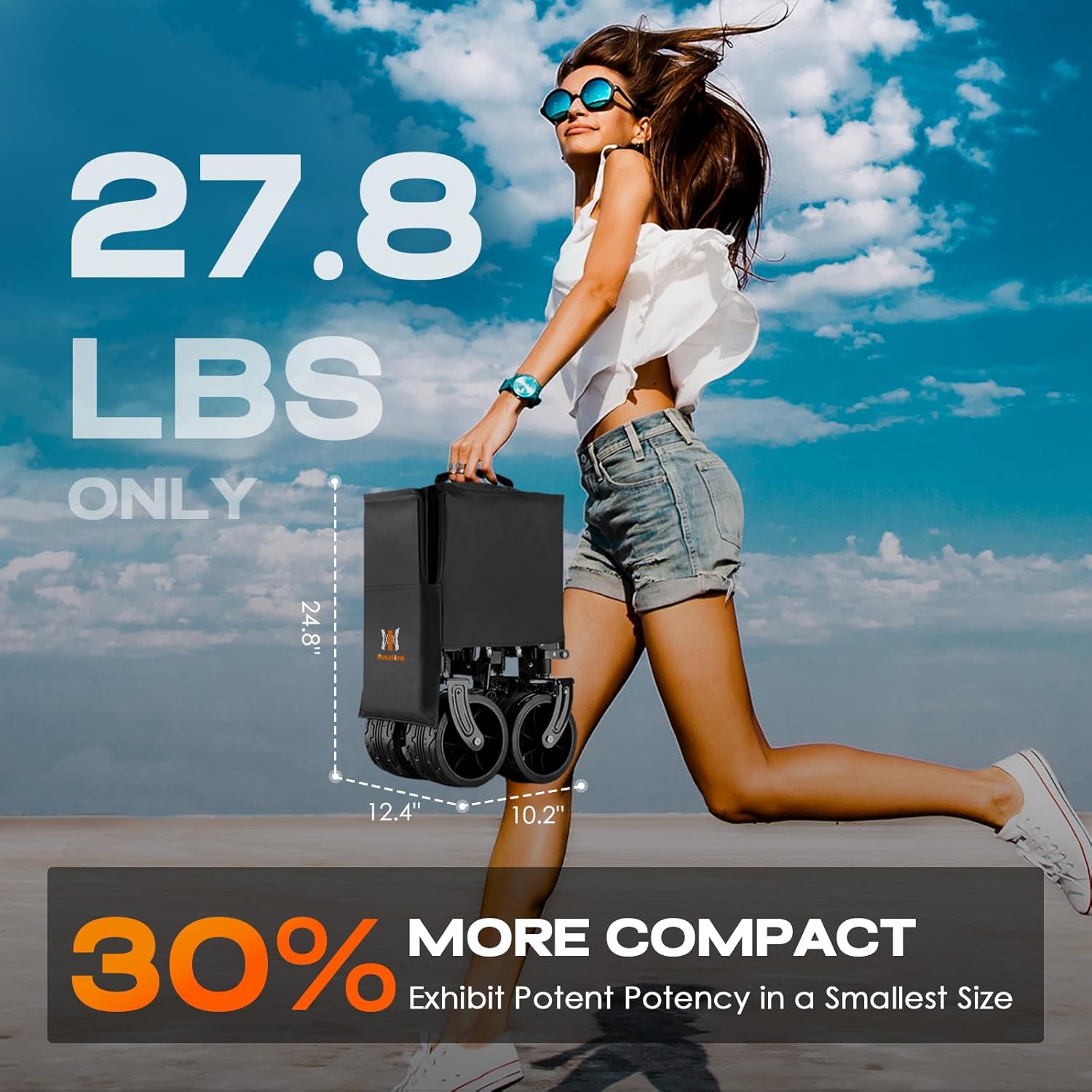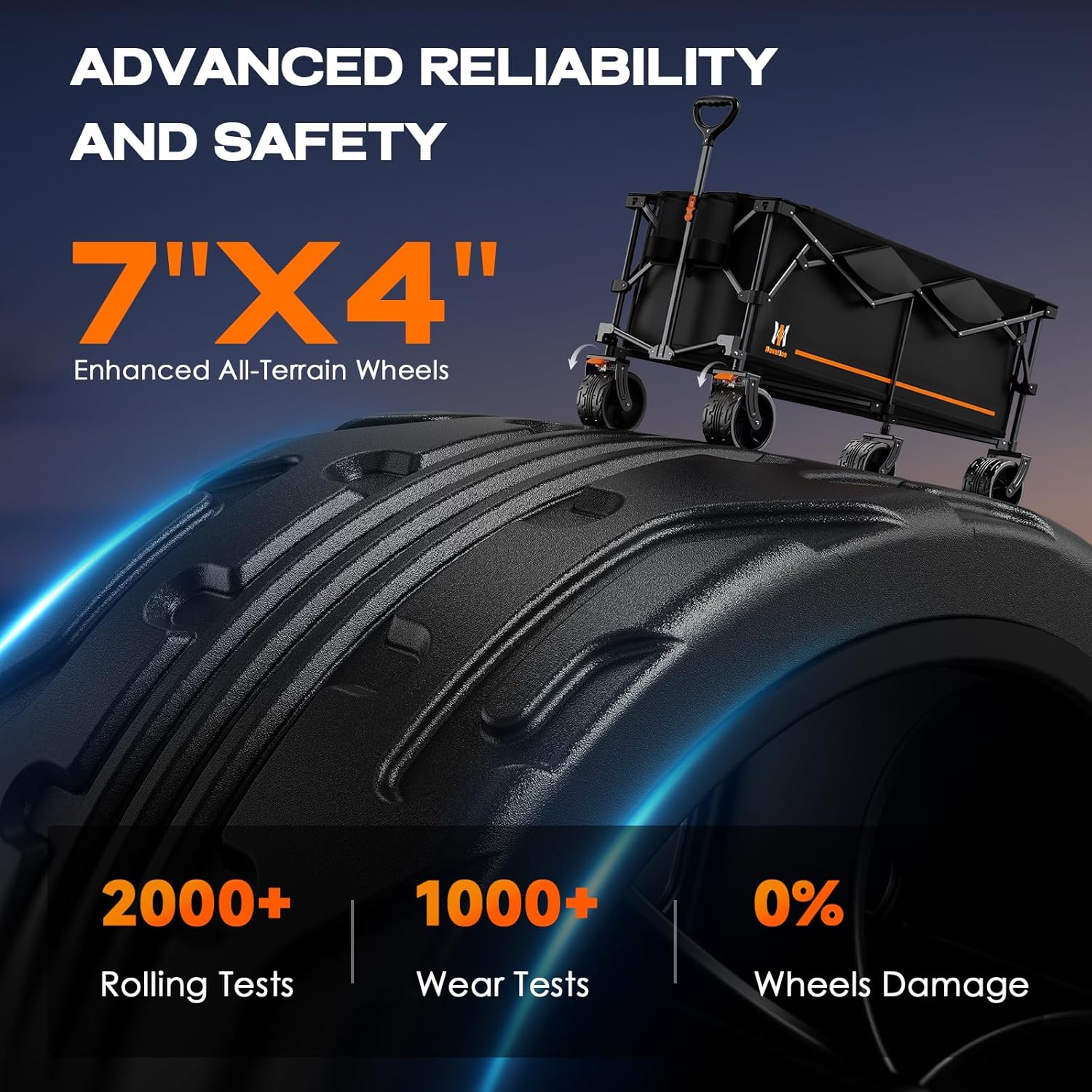 • All-Terrain Wheels & Dual Brakes: Dual-bearing wider wheels glide smoothly over grass and gravel roads. Front dual brakes lock the wagon with a step—no sliding even on slopes, maximum safety. 360° front wheels for easy steering. (Warm Notice: Not for soft sand).