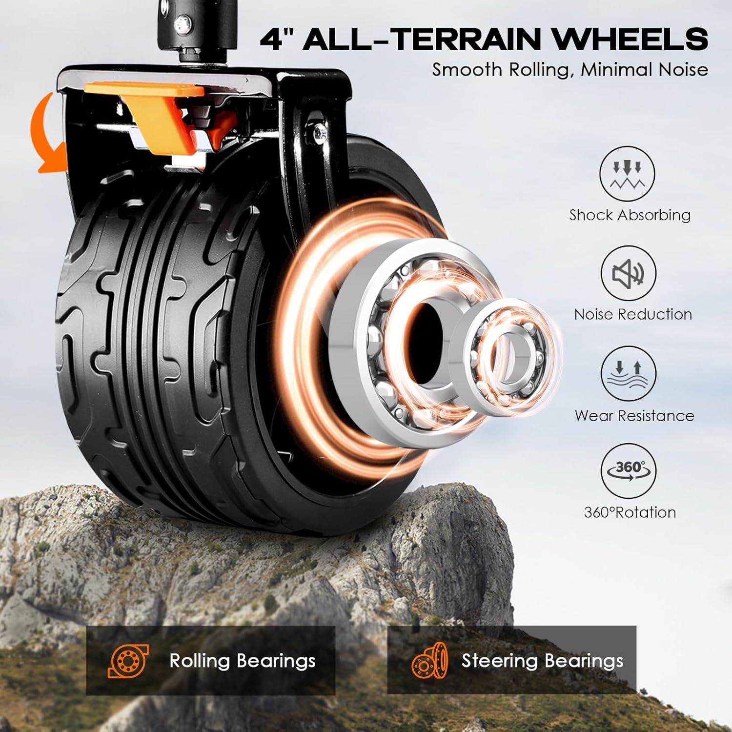 • SMOOTH NAVIGATION: Equipped with robust 4" wide all-terrain wheels, crafted from durable, high-hardness PVC with anti-slip treads and precise ball bearings, this wagon ensures seamless movement even under substantial loads. Safety is paramount, with foot brakes on the front wheels providing stability on inclines. The retractable handle, rotating a full 360 degrees, offers effortless steering control.