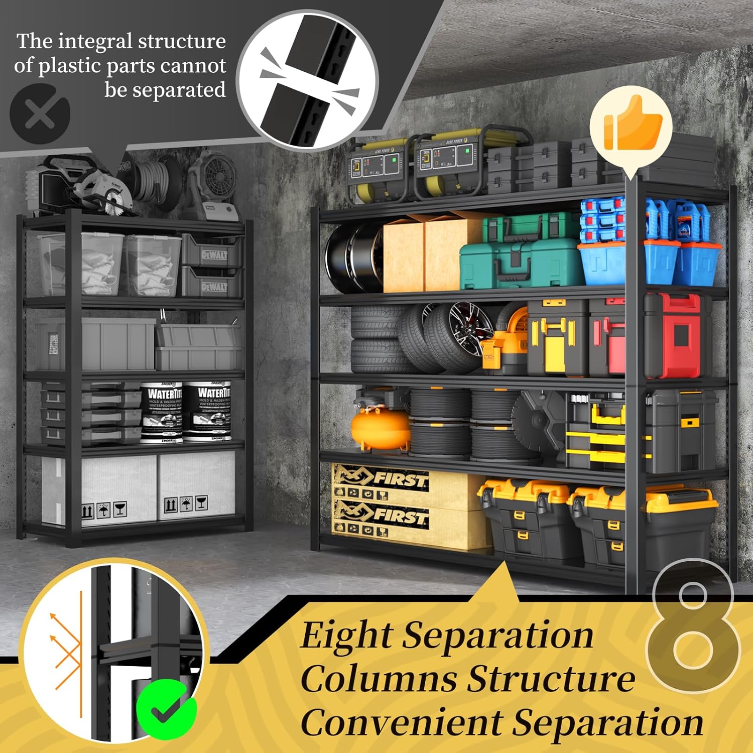 • Sturdy and Durable Construction: Built with high-quality metal and reinforced with double-thickened legs and an anti-rust coating, this shelving unit offers exceptional strength. Each shelf can hold up to 600 lbs, with a total weight capacity of 3000 lbs, making it ideal for heavy-duty storage needs.