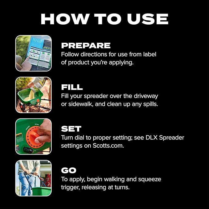 • Use the Scotts Turf Builder EdgeGuard DLX Broadcast Spreader to apply Scotts lawn care products