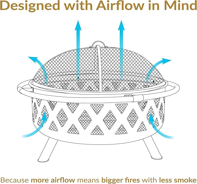 • IMPROVED AIRFLOW AND SAFETY: The outdoor fireplace for patio includes a metal spark screen and mesh-covered cutouts for added safety from flying sparks, a weather-resistant round cover, and a poker tool to safely maneuver the burning logs. The outer ring also ensures that everyone remains a safe distance from the flames. The fire pit features a built-in wood-burning grate and cutouts for better airflow. This allows the fire to burn steadier for long-lasting fires with less smoke and more heat.