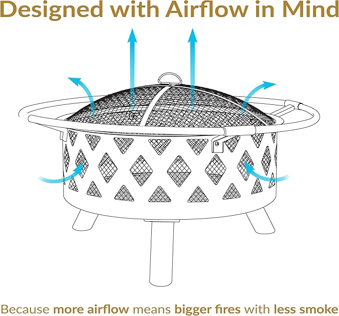 • IMPROVED AIRFLOW AND SAFETY: The outdoor fireplace for patio includes a metal spark screen and mesh-covered cutouts for added safety from flying sparks, a weather-resistant round cover, and a poker tool to safely maneuver the burning logs. The outer ring also ensures that everyone remains a safe distance from the flames. The fire pit features a built-in wood-burning grate and cutouts for better airflow. This allows the fire to burn steadier for long-lasting fires with less smoke and more heat.