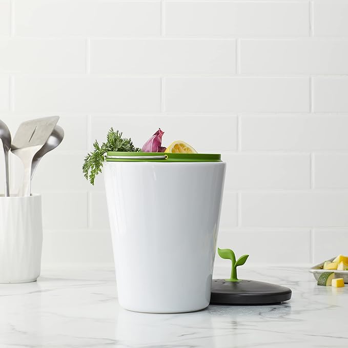 • CONTEMPORARY DESIGN: Modern 3 liter (0.75 gallon) ceramic countertop compost bin, featuring a vented lid, removable inner bucket, and a replaceable natural charcoal filter that traps and absorbs odors.